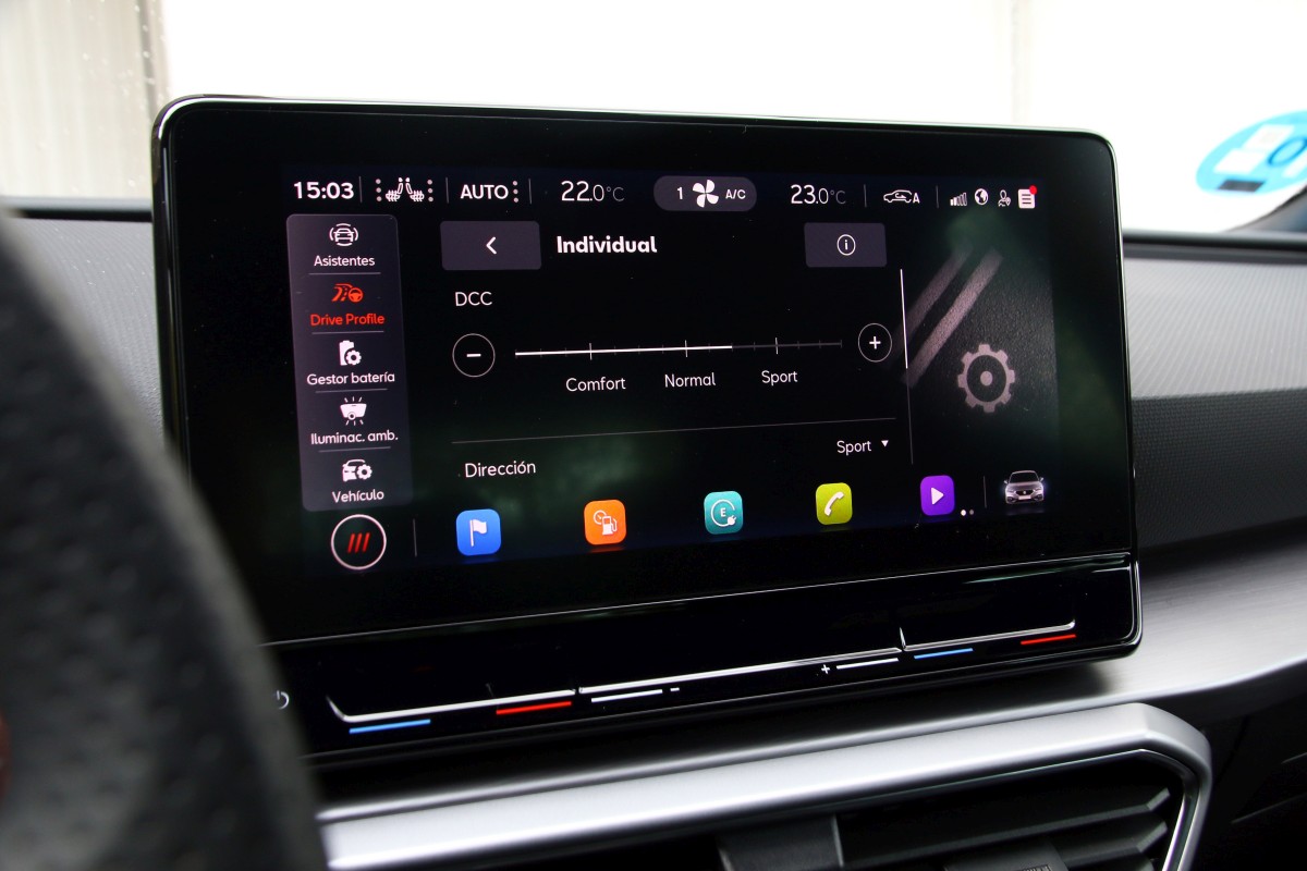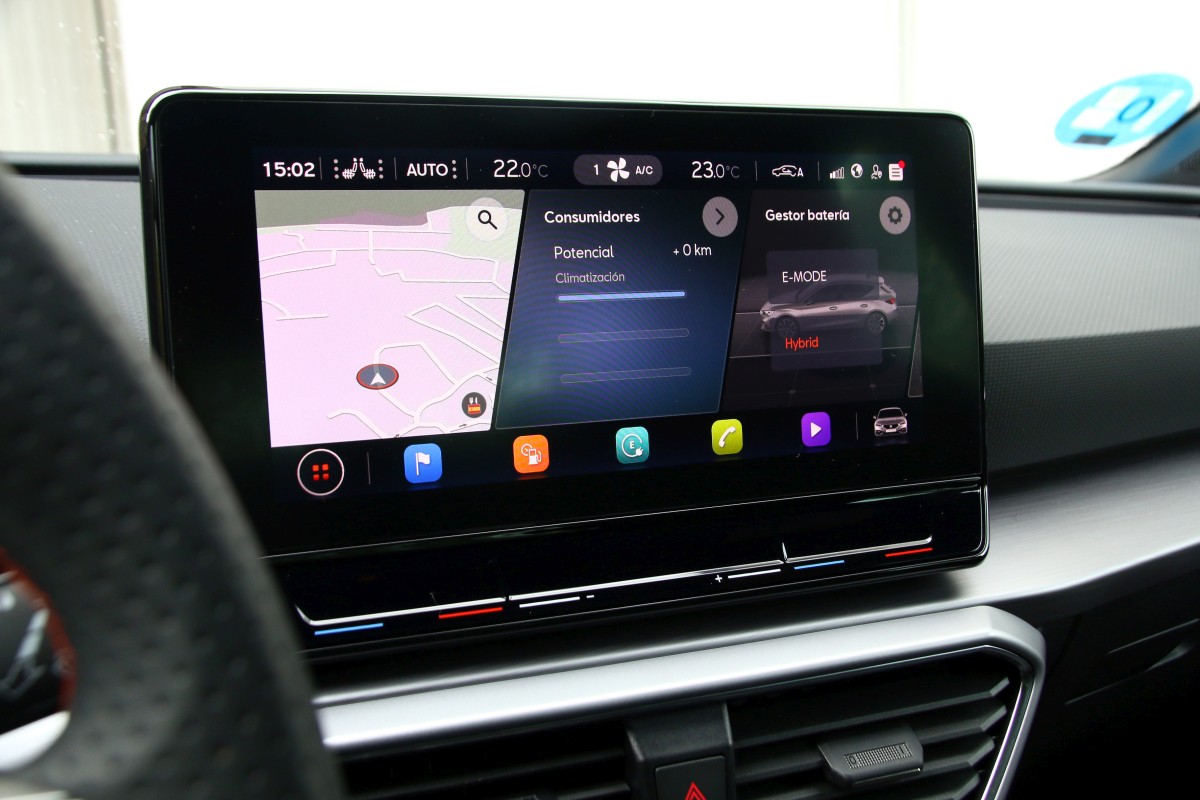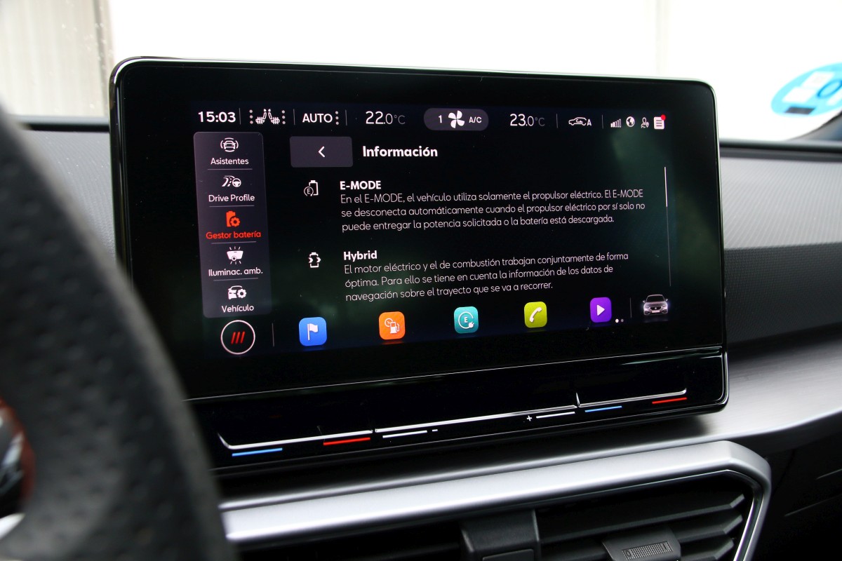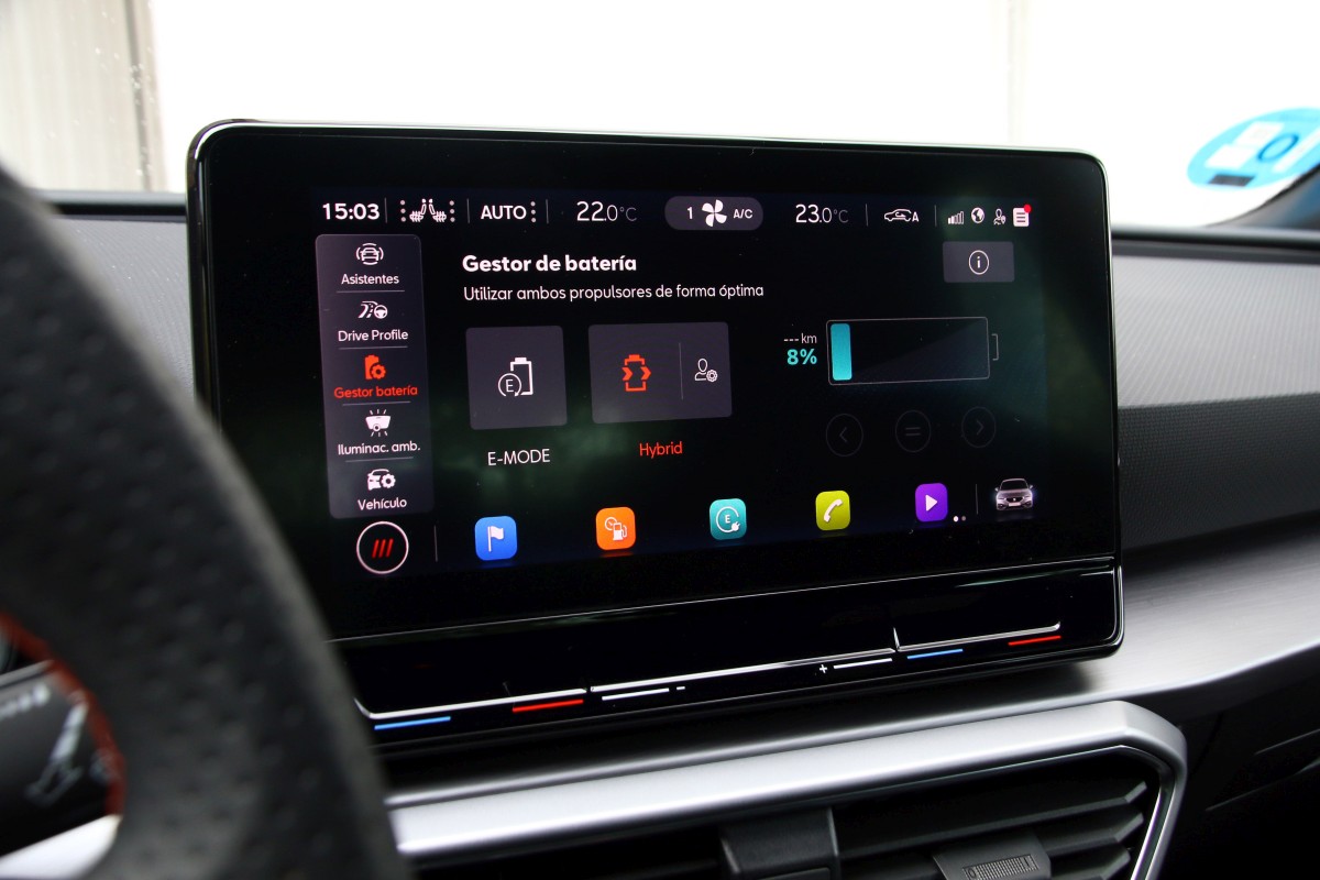 Pero es al combinar ambos bloques cuando saca a relucir todo su rendimiento. El aporte eléctrico se deja notar y mucho, sobre todo a la hora de realizar un adelantamiento. Además de los programas E-MODE e Hybrid, contamos con los típicos de cualquier León: Eco, Comfort, Normal y Sport, que inciden sobre el carácter de coche e, incluso, sobre la dureza de los amortiguadores.
