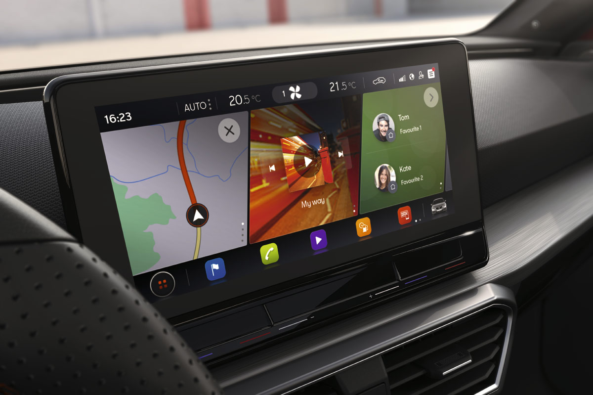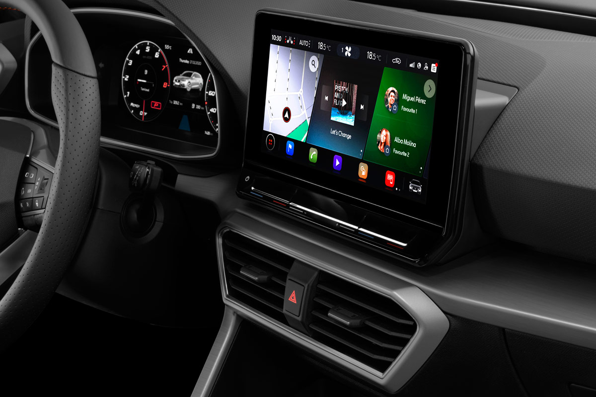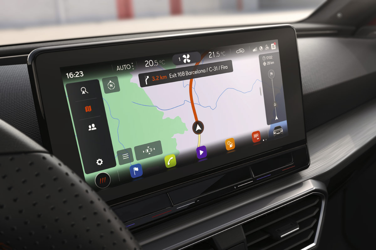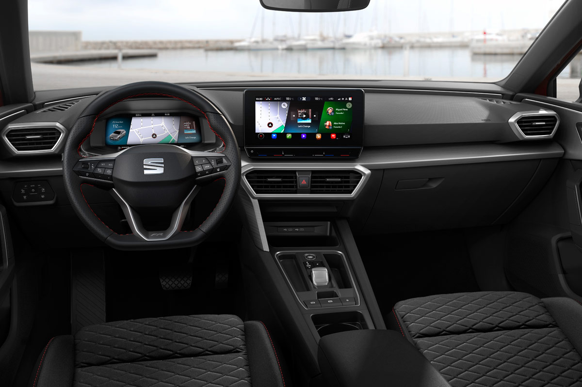 Quizá el salto de calidad más importante lo haya dado el interior. Equipa mejores materiales y la gran mayoría de ellos son plásticos blandos y componentes de tacto gomoso, además de molduras que simulan madera; otras adoptan el color del titanio. Además, presenta un diseño muy limpio, donde las líneas rectas del salpicadero marcan el paso. También las dos pantallas, la del cuadro de instrumentos digital, que es de 10,25 pulgadas y la del sistema de infoentretenimiento, que puede ser de 8,25 o de 10 pulgadas. Se ha buscado un estilo minimalista donde llama la atención la ausencia de botones... Malditas modas. ¡Eh! Espera antes de crucificarlo. La ventaja que tiene el León frente a sus rivales es que las acciones de subir y bajar grados como aumentar o disminuir el volumen tienen tecla táctil propia. No es igual de cómodo que un botón físico, pero nos ha convencido. El resto se activan y desactivan en el menú del sistema multimedia, que tiene una interfaz súperatractiva y muy intuitiva.