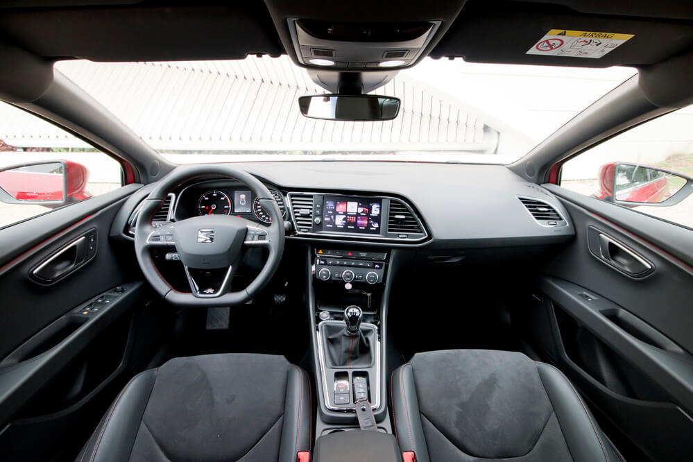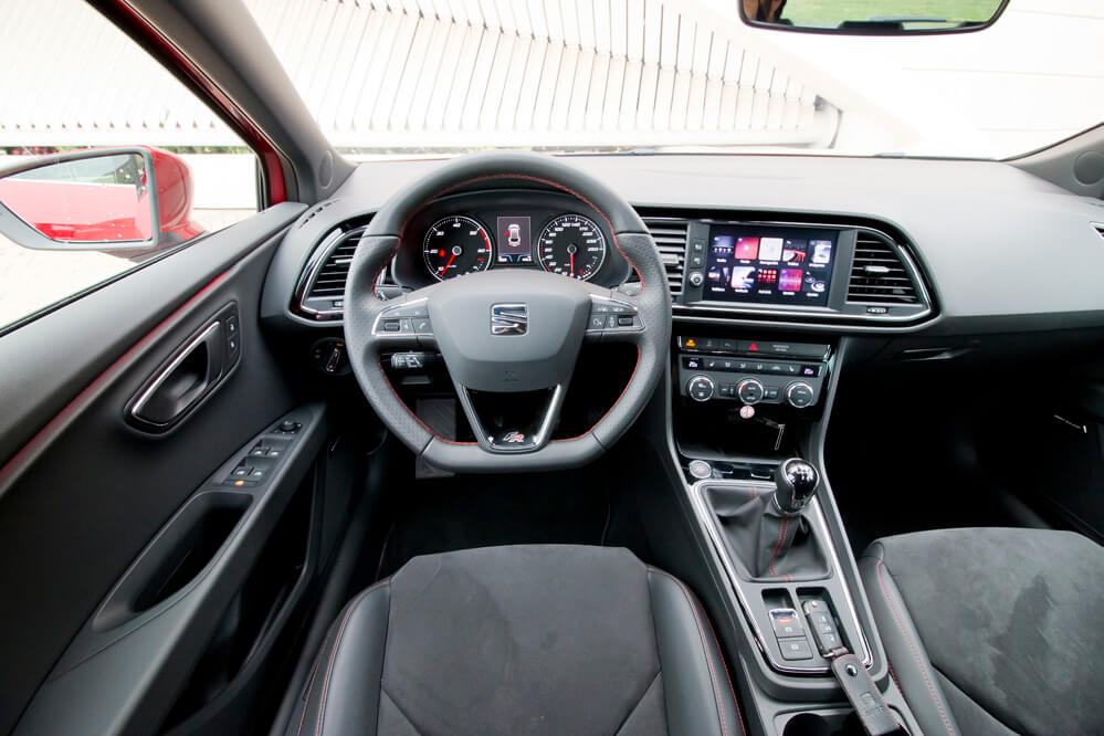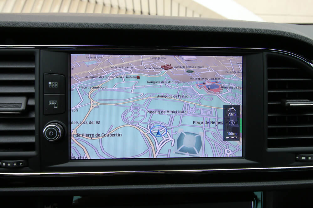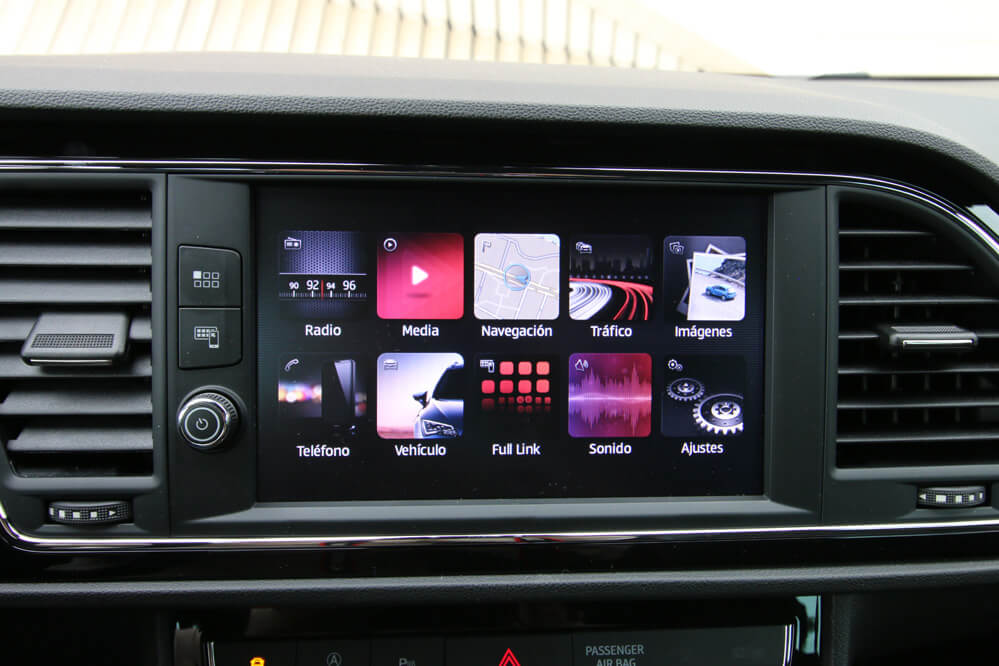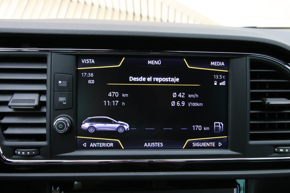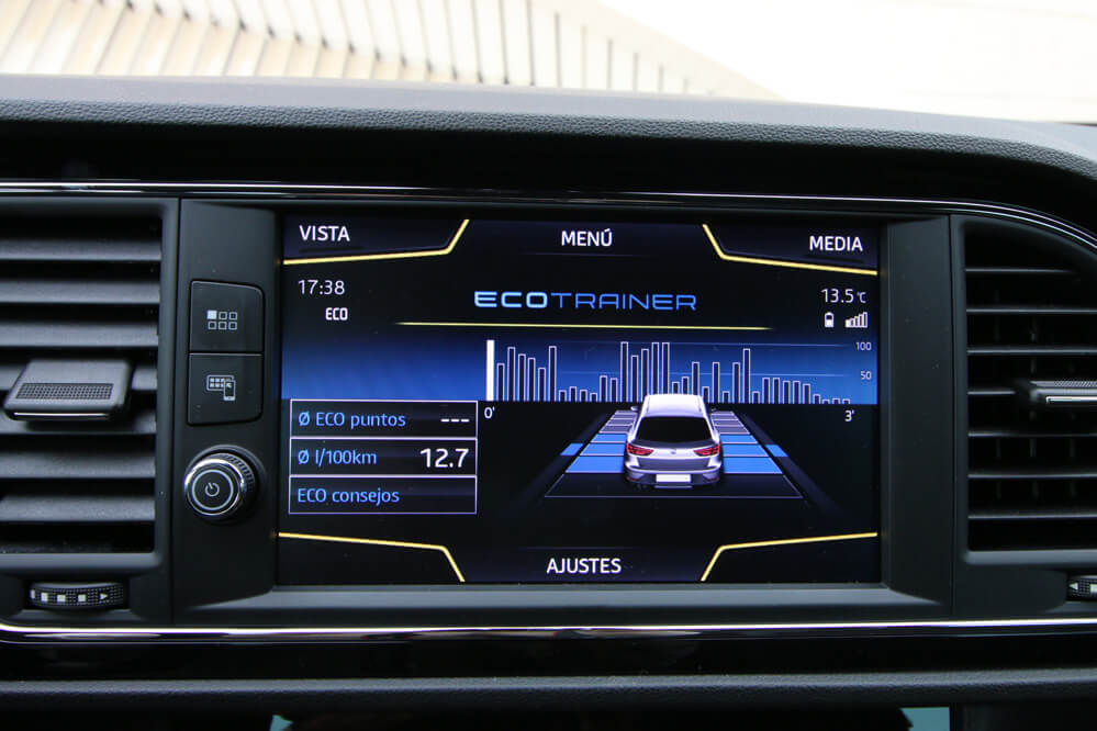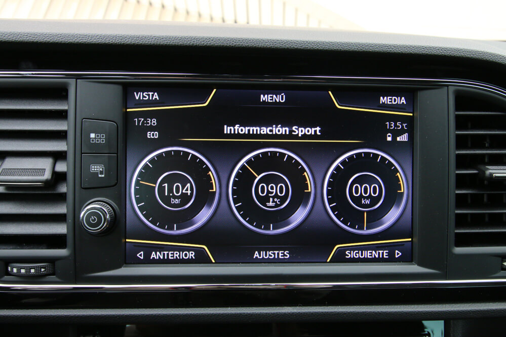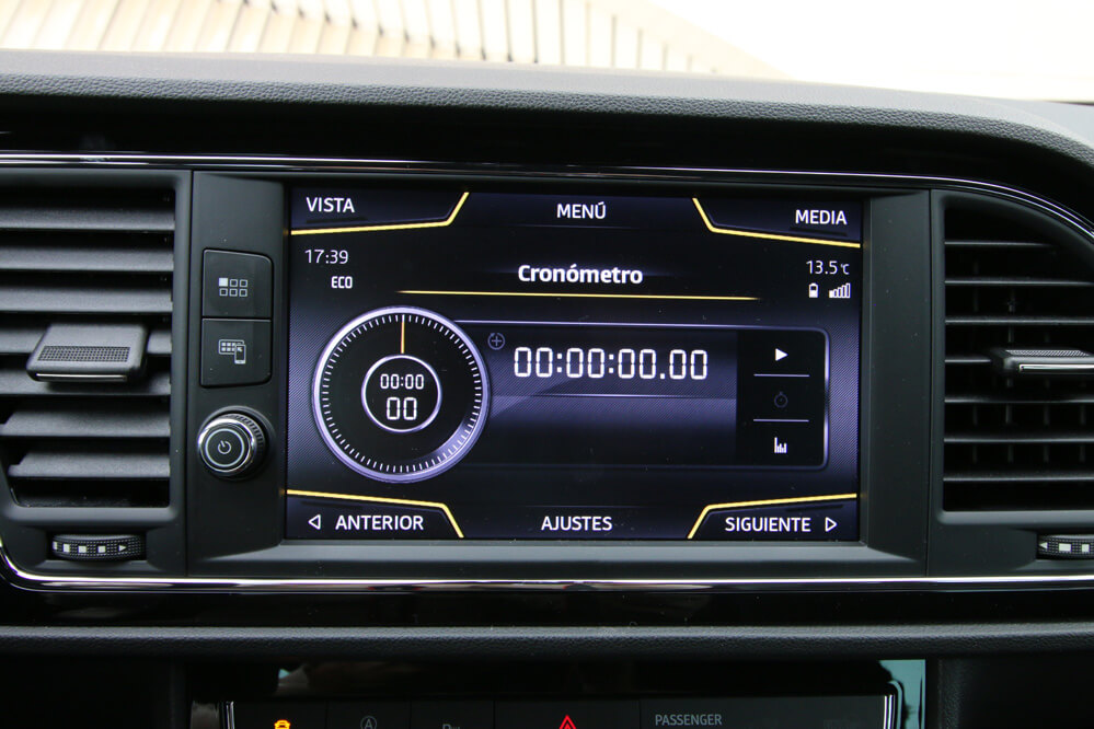 En el interior, los cambios son mínimos: la principal es la nueva pantalla, que muestra ahora la información de una manera más clara y simple. ¡Se parece mucho a la pantalla de un teléfono móvil! La verdad es que en ella se ofrece todo tipo de información: desde el navegador con algunos edificios en tres dimensiones, hasta una serie de elementos ‘pijos’ como el ‘ecotrainer’, para mejorar tu eficiencia, el indicador de potencia en kW o la presión del turbo, y otros elementos que incluso se pasan: ¿un cronómetro en un SEAT León diésel? Tampoco es un Porsche 911 GT3 RS...