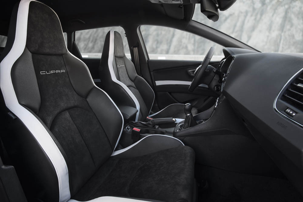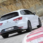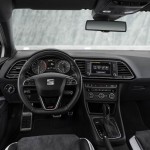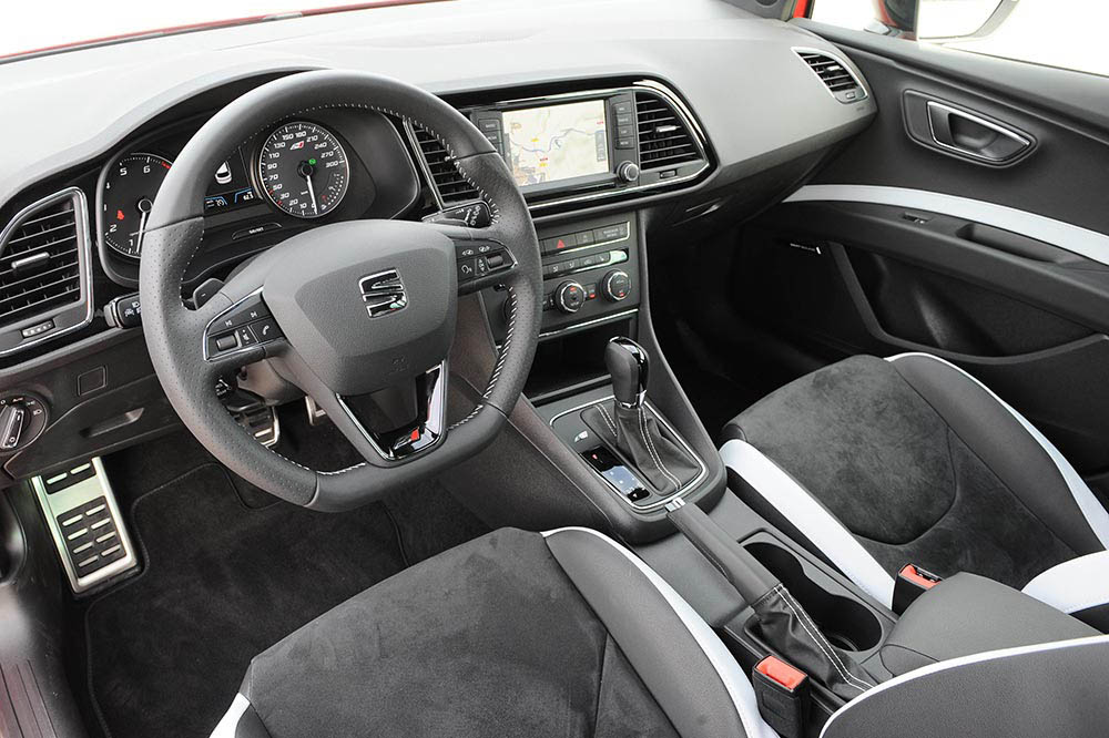Además, el interior del SEAT León ST Cupra, modelo que hemos puesto a prueba, también se caracteriza por el nuevo volante deportivo multifunción de diseño exclusivo y con la parte interior achatada. Está tapizado en cuero, parcialmente perforado y en la versión automática incorpora las levas del cambio DSG. También dan exclusividad los asientos deportivos en Alcántara, en color gris oscuro que tienen costuras blancas y partes de cuero en este último color y en negro, lo mismo que los paneles de las puertas -los opcionales, que son semibacquets, guardan la misma configuración-.