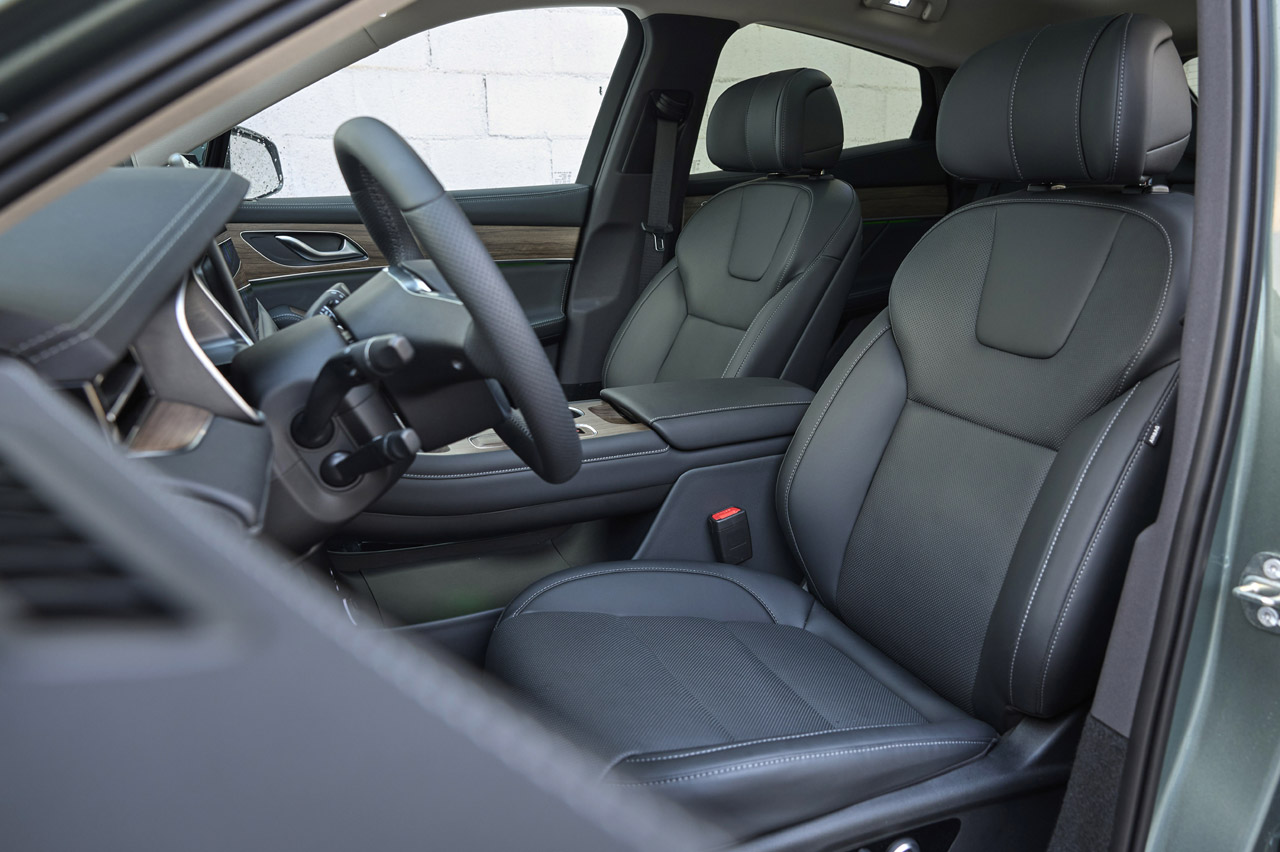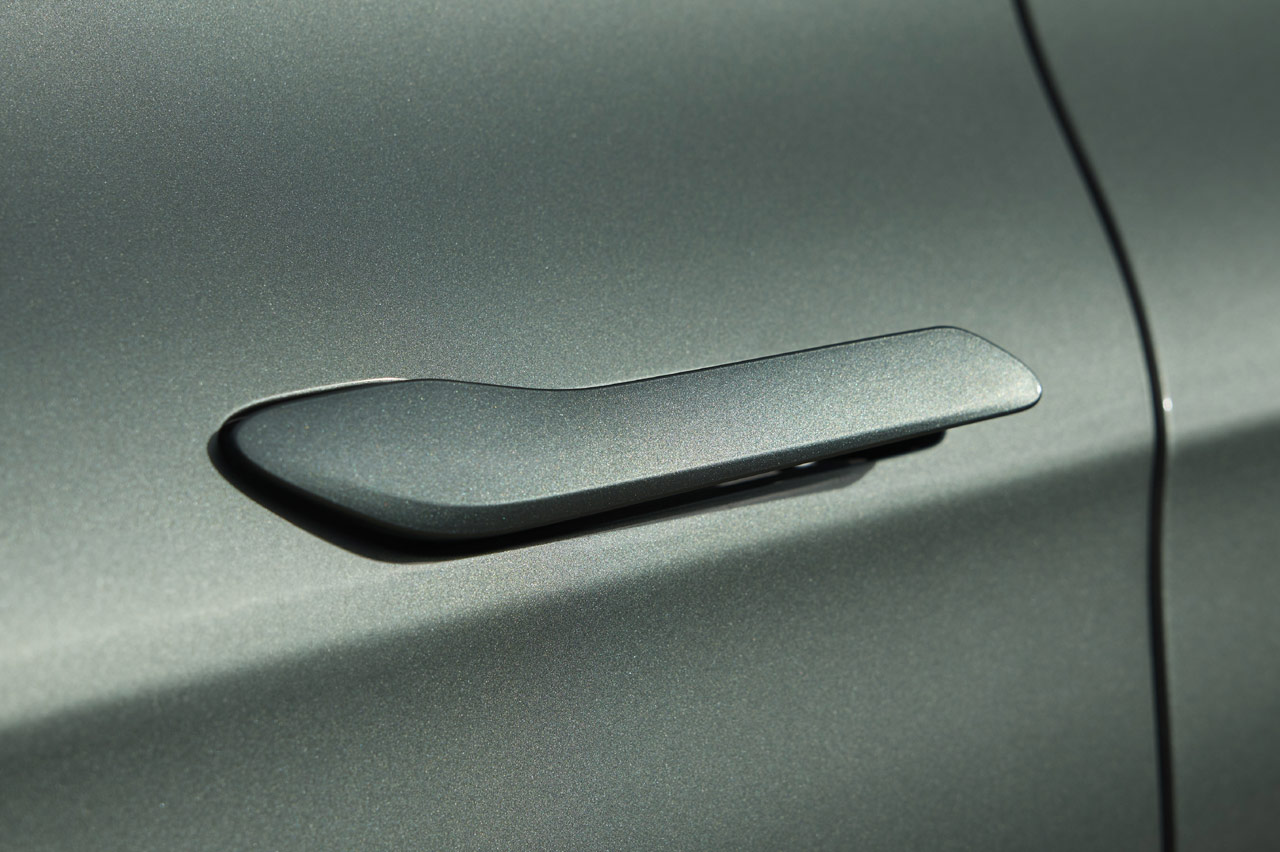 En el frontal destacan esos faros de ledes con sus correspondientes luces diurnas, que se extienden hacia abajo en forma de ‘L’. Su largo capó y su inclinado parabrisas aportan músculo al frontal, al igual que la marcada y voluptuosa línea de cintura. La vista lateral es igualmente imponente, con amplios pasos de ruedas rellenados con unas generosas llantas de 20 pulgadas (con neumáticos en medida 255/45 R20) o unas manetas para abrir las puertas que quedan enrasadas con la carrocería cuando no son necesarias.