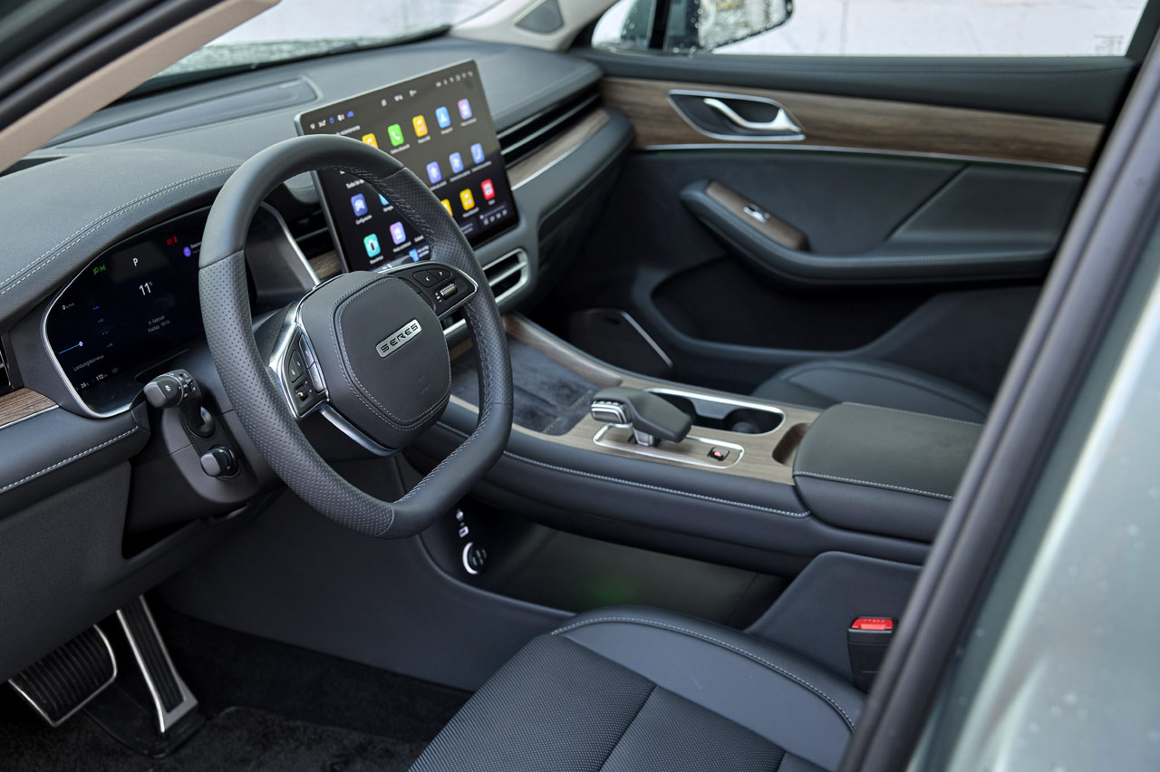 El habitáculo me ha sorprendido tanto por su diseño, muy minimalista, como por la calidad y solidez de construcción que transmite. El salpicadero está presidido por la generosa pantalla del sistema de información y entretenimiento, de 15,6 pulgadas. Es táctil y desde ella se controlan todas las funciones del coche, pudiendo personalizar accesos rápidos y ofreciendo un funcionamiento fluido. Es compatible tanto con Android Auto como con CarPlay de Apple.