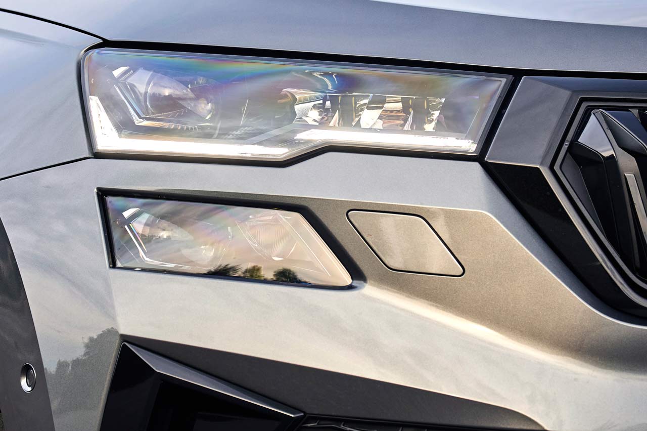 Inicio la prueba del Skoda Karoq 2022 echando un vistazo a su renovado exterior. Es fácil darse cuenta de que los faros son más afilados, que la parrilla es más ancha y tiene forma hexagonal y que los paragolpes son de nuevo cuño. Debido a ello, la longitud del todocamino checo es 7 mm más amplia. Los grupos ópticos delanteros mantienen esa distribución partida en dos tan característica, pero como novedad reciben la tecnología Matrix Full LED.