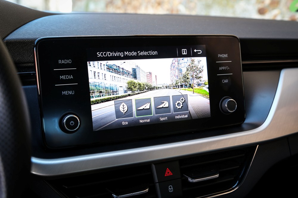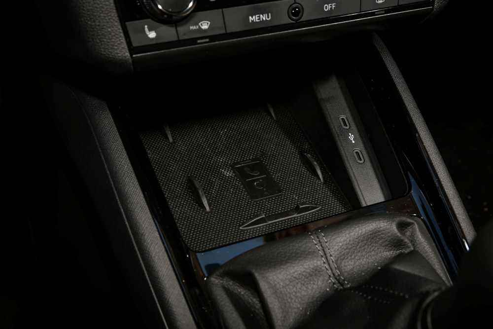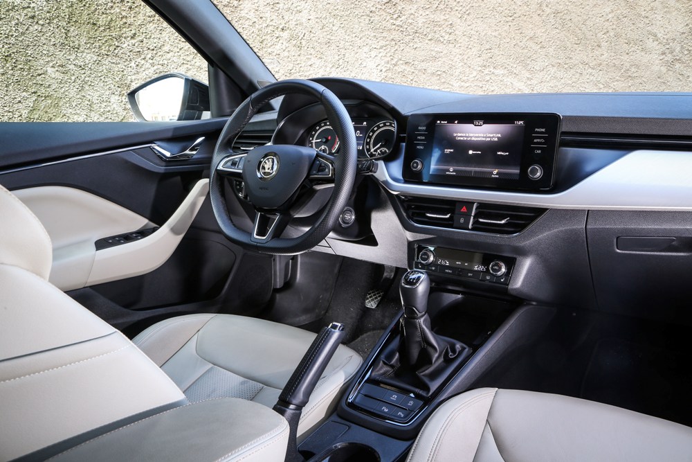 El interior es un fiel reflejo de lo que ha estado haciendo Skoda estos últimos años en sus vehículos. Todo se centra alrededor de la pantalla del sistema de infoentretenimiento, intuitivo y de gran respuesta, la cual adopta un diseño flotante en la parte superior de la consola. Debajo encontramos las salidas de ventilación centrales y el climatizador bizona, un elemento que recuerda al de otros productos del Grupo Volkswagen. En la base de la consola tenemos un punto de carga inalámbrico opcional para dispositivos móviles y, en este caso, la palanca de cambios manual y un grupo de interruptores para los modos de conducción, el aparcamiento asistido o el Start&Stop.