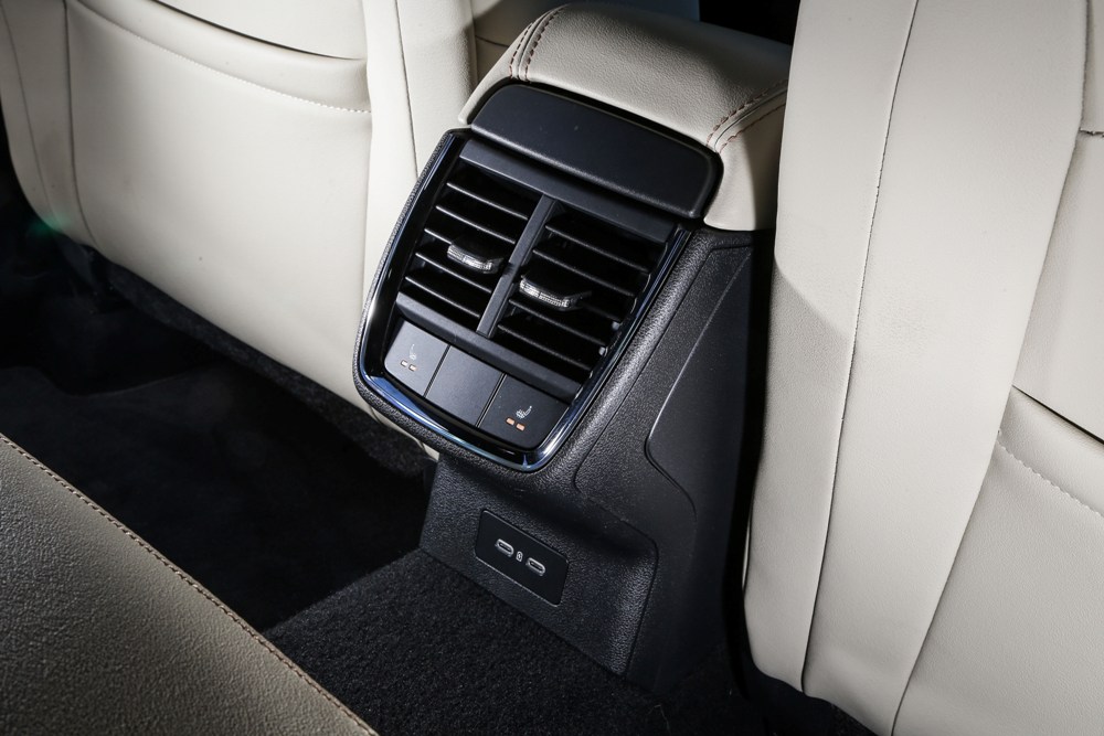 El acceso a las plazas traseras es amplio gracias a la forma de las puertas y, una vez dentro, me encuentro con tres plazas donde el espacio para la cabeza (pese al techo panorámico), los hombros y las rodillas es sobresaliente. Especial mención merece el espacio para las piernas, ya que, con el asiento del conductor configurado para mí (mido 180 cm), aún sobra el suficiente hueco para incluso intentar estirar un poco las rodillas. Esta virtud tan solo se ve eclipsada por una plaza central menos práctica, con un mullido más duro, un respaldo configurado para convertirse en un apoyabrazos y un túnel central demasiado alto que nos deja casi sin sitio para colocar los pies.