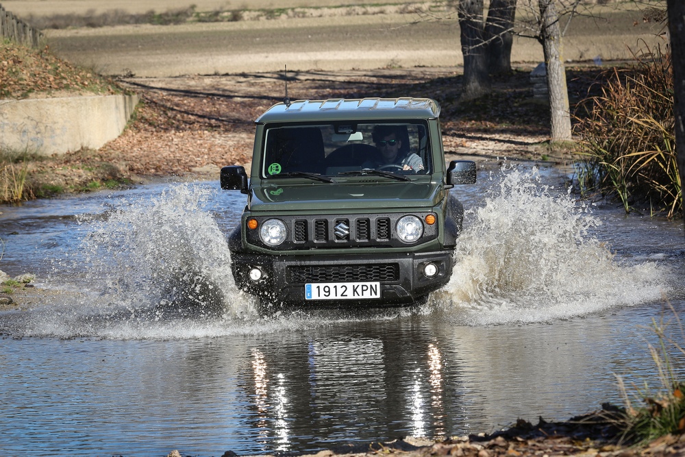 Los pequeños voladizos delanteros y traseros, unidos a unos paragolpes compactos y a una distancia entre ejes reducida, convierten al Suzuki Jimny 2019 que pruebo en una máquina muy capaz en el campo. La altura libre mínima al suelo es de 21 cm, el ángulo de ataque es de 37 grados, con un ángulo ventral de 27 grados y un ventajoso ángulo de salida de 49 grados. Unos datos que, exceptuando el de ataque, mejoran incluso los que ofrecen modelos como el nuevo Jeep Wrangler 2018 (prueba).