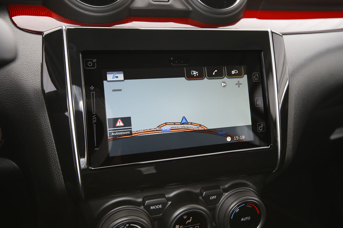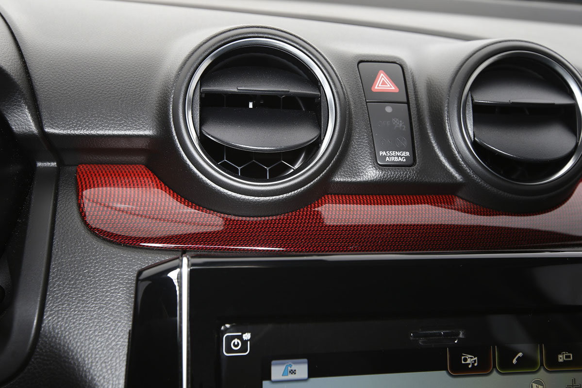 El puesto de mandos está compuesto por plásticos duros, pero dan sensación de solidez. Gana puntos con las molduras en rojo y en negro piano. Lástima que el Suzuki Swift Sport Mild Hybrid se sume a la moda de suprimir algunos de los botones, como los de subir o bajar el volumen, aunque, por suerte y de forma totalmente acertada, mantiene los del sistema de climatización.