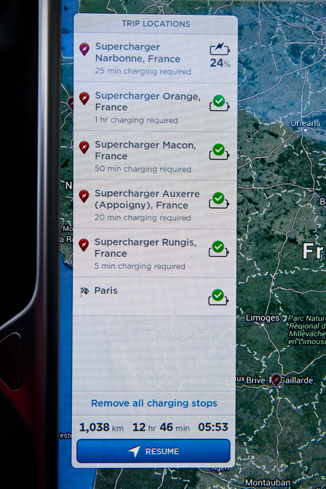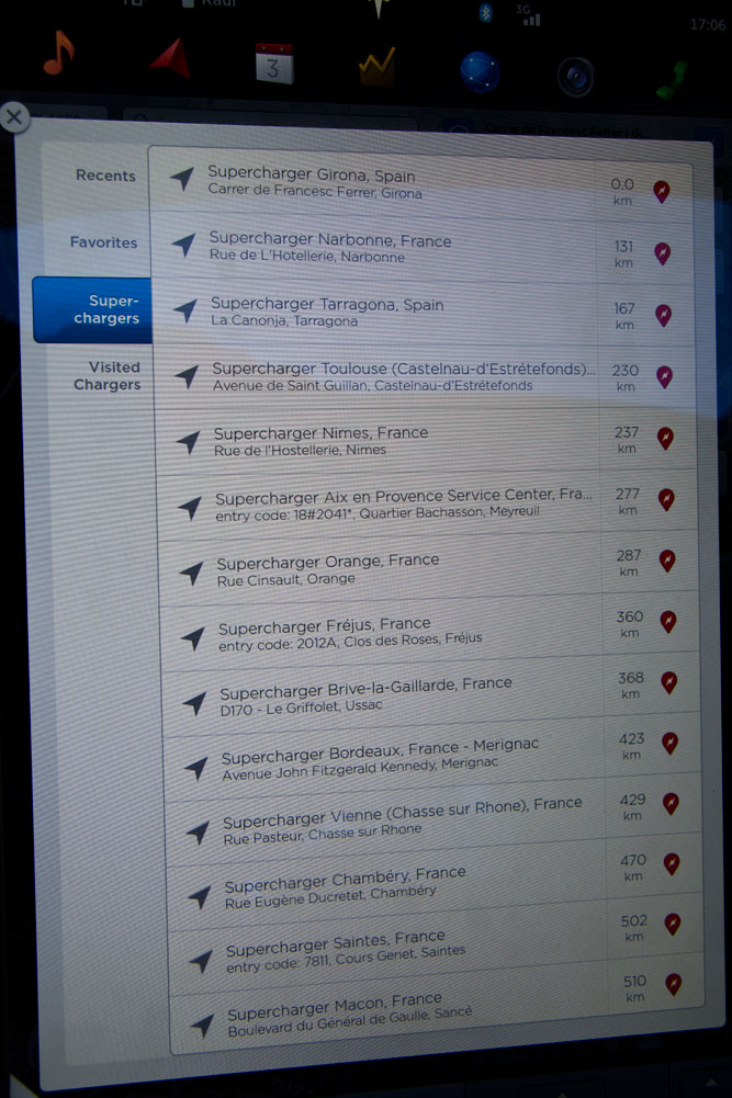 Pero bueno, en esta prueba del Tesla Model S P85+ no pretendo quedarme tirado en la cuneta a la primera de cambio y decido relajar el uso del acelerador, aunque cuesta, ya que ese nivel de empuje puede llegar a ser adictivo. El sistema de navegación y de entretenimiento es un auténtico ejemplo a seguir. La claridad y cantidad de información son un espectáculo y la rapidez de las órdenes del navegador, instantáneas. Estés donde estés, el Tesla Model S te informa dónde se encuentran los puntos de carga más cercanos: decido probar la tecnología de los supercargadores y decir acudir al punto de Tarragona.