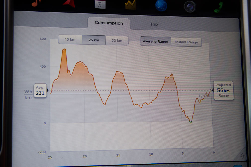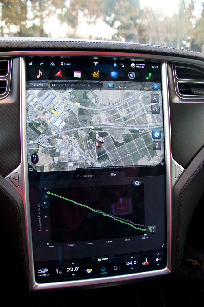 Nada más incorporar el destino, el sistema calcula la energía restante y te hace un mapa gráfico con el modo en el que vas a gastar la energía basándose en la vía por la que se circula, las irregularidades del terreno y tu modo de conducción. Es algo realmente útil, ya que calcula por ti con bastante precisión la autonomía que requieres para realizar un trayecto. En el Tesla Model S los cálculos y las matemáticas están siempre presentes y más en España, donde los puntos de carga brillan por su ausencia.