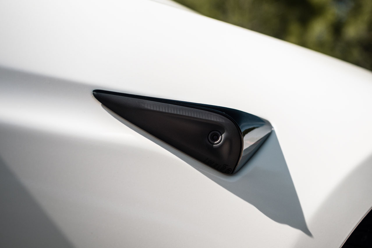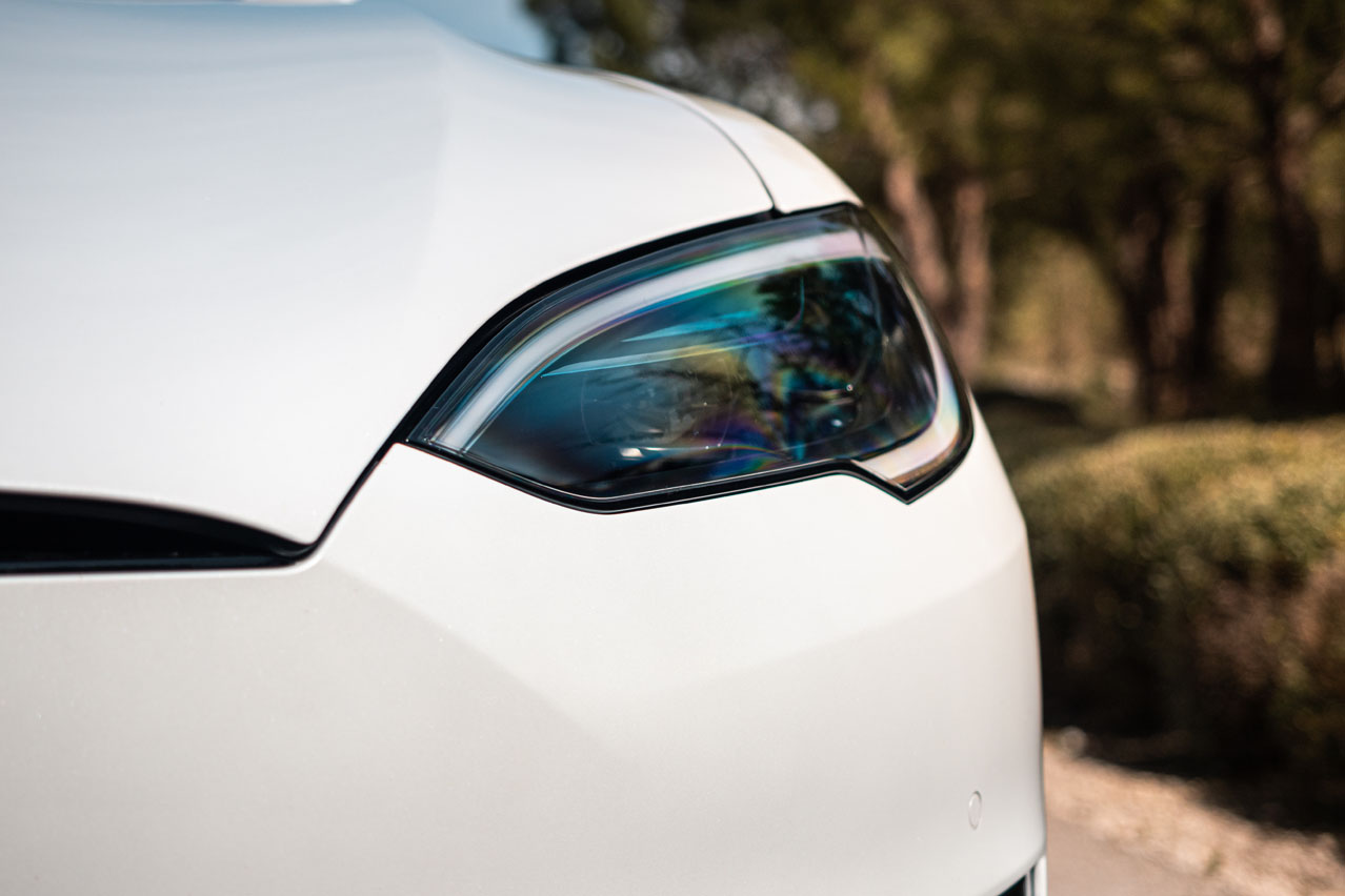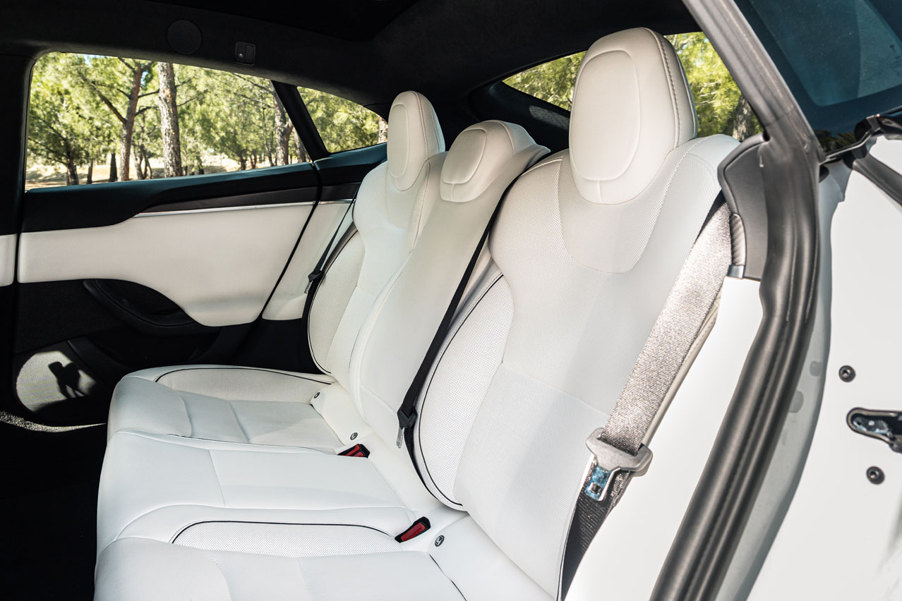 El nuevo Model S viene con una toma más amplia en el paragolpes delantero. Las luces antiniebla también son de nuevo cuño. Las llantas de aleación son de 19", aunque las de la unidad de pruebas son de 21" -las dos únicas medidas disponibles- y van bañadas en negro, cosa que le queda genial con el blanco de la carrocería. Asimismo, las molduras abandonan el cromo para ser oscuras, al igual que el listón del portón. En el caso de esta versión, se suma un alerón realizado en carbono. El toque deportivo se lo dan las ventanillas sin marco y las manetas enrasadas en las puertas. Con este coche no necesitas llave para abrirlo; puedes realizar la acción mediante una tarjeta o el smartphone con el Bluetooth activado, y que al acercarte, te reconoce y despliega sus tiradores.