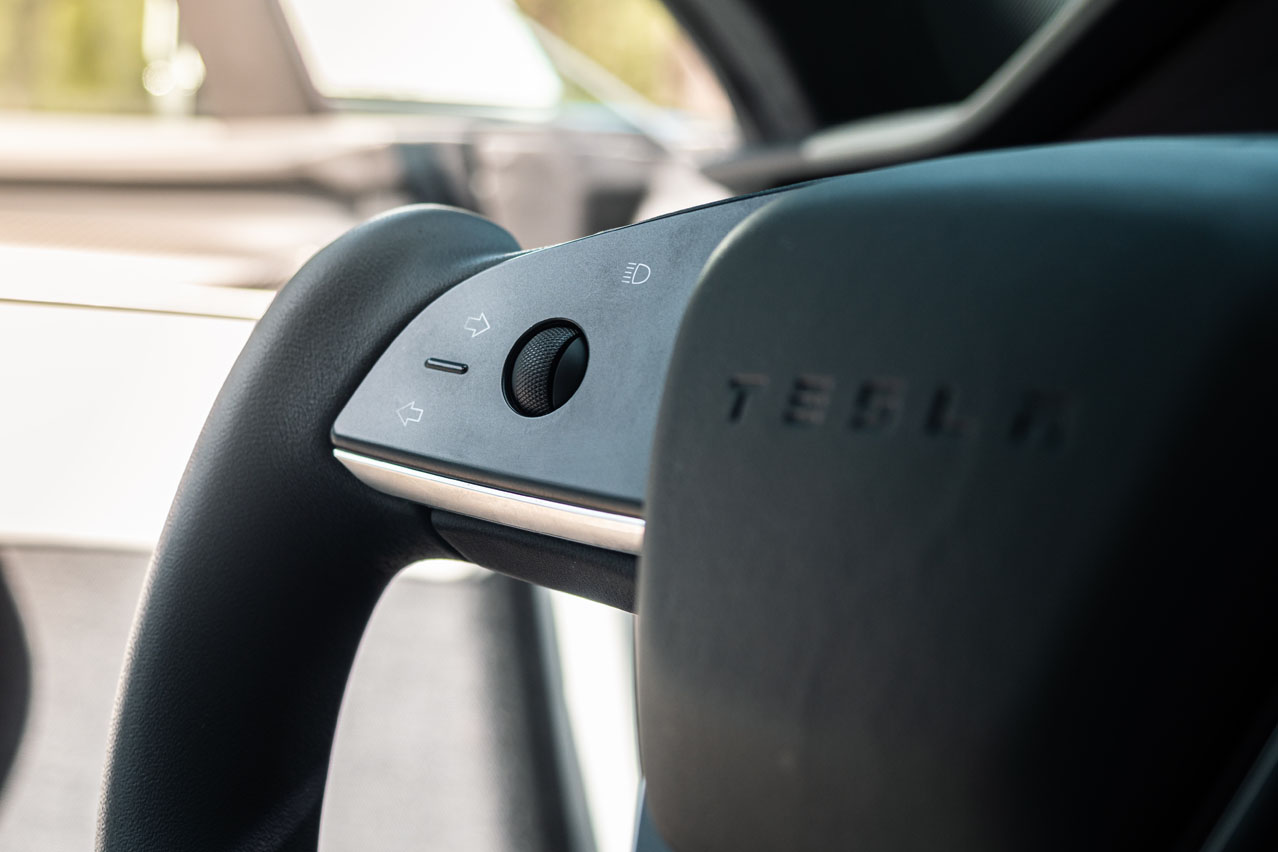 La más grande es a la hora de maniobrar, puesto que tiene 2,33 vueltas de volante entre topes. Al aparcar puedes tirar del recurso del bayetazo, pero en movimiento, en un tramo de curvas cerradas o a alta velocidad, ante un contratiempo en el que necesites realizar movimientos rápidos... Lo siento, pero no lo compro. También tapa el selector de marcha, que si sitúa a la izquierda de la pantalla -no existen botones D, N, R y P físico, y después de probar el de Tesla, creo que no es necesario-.