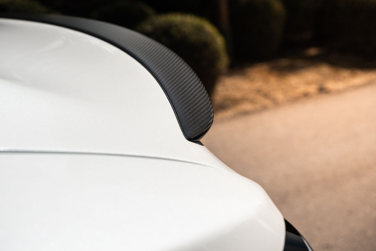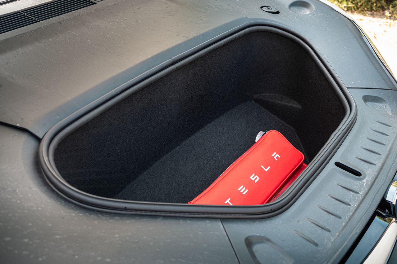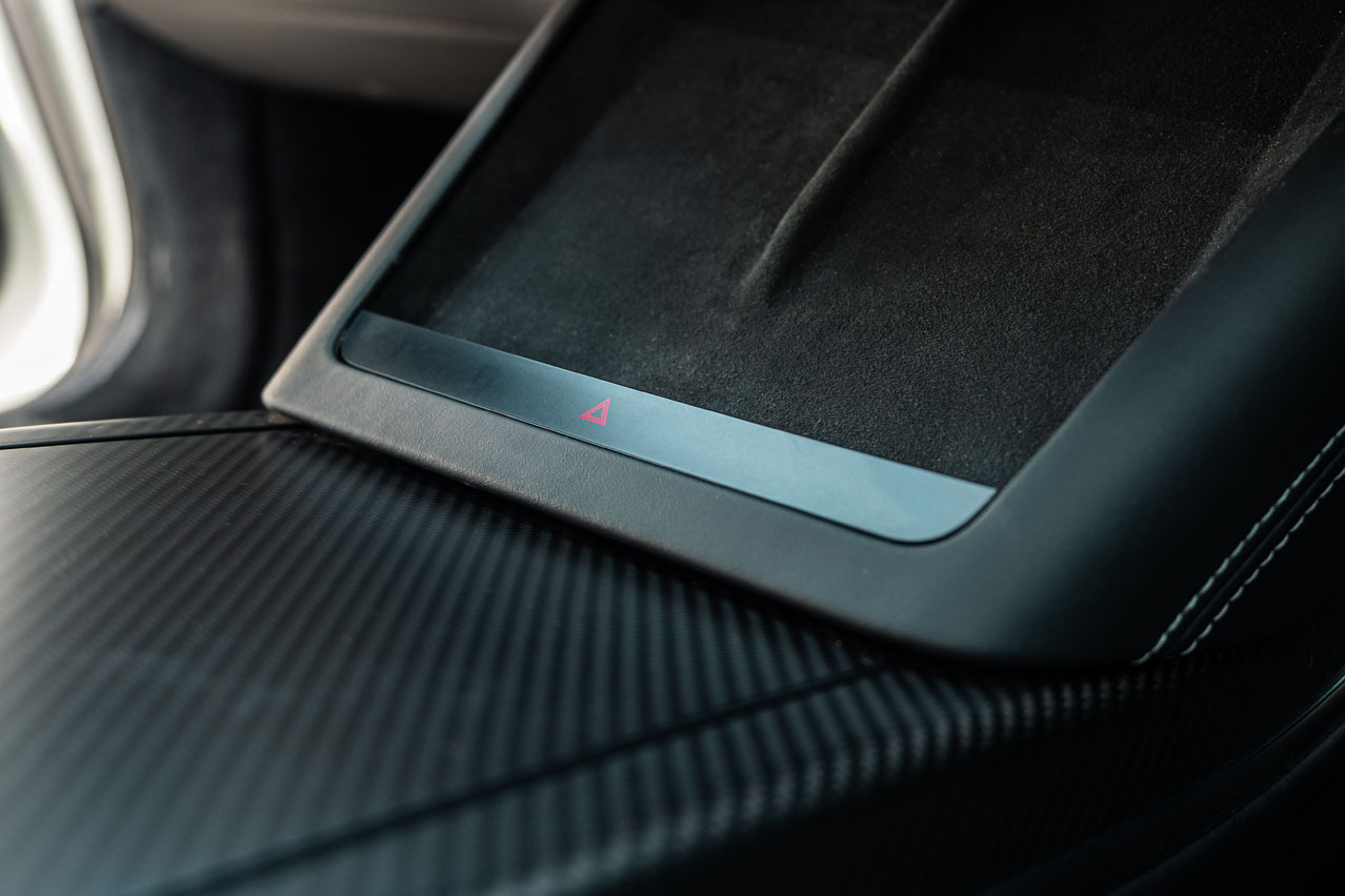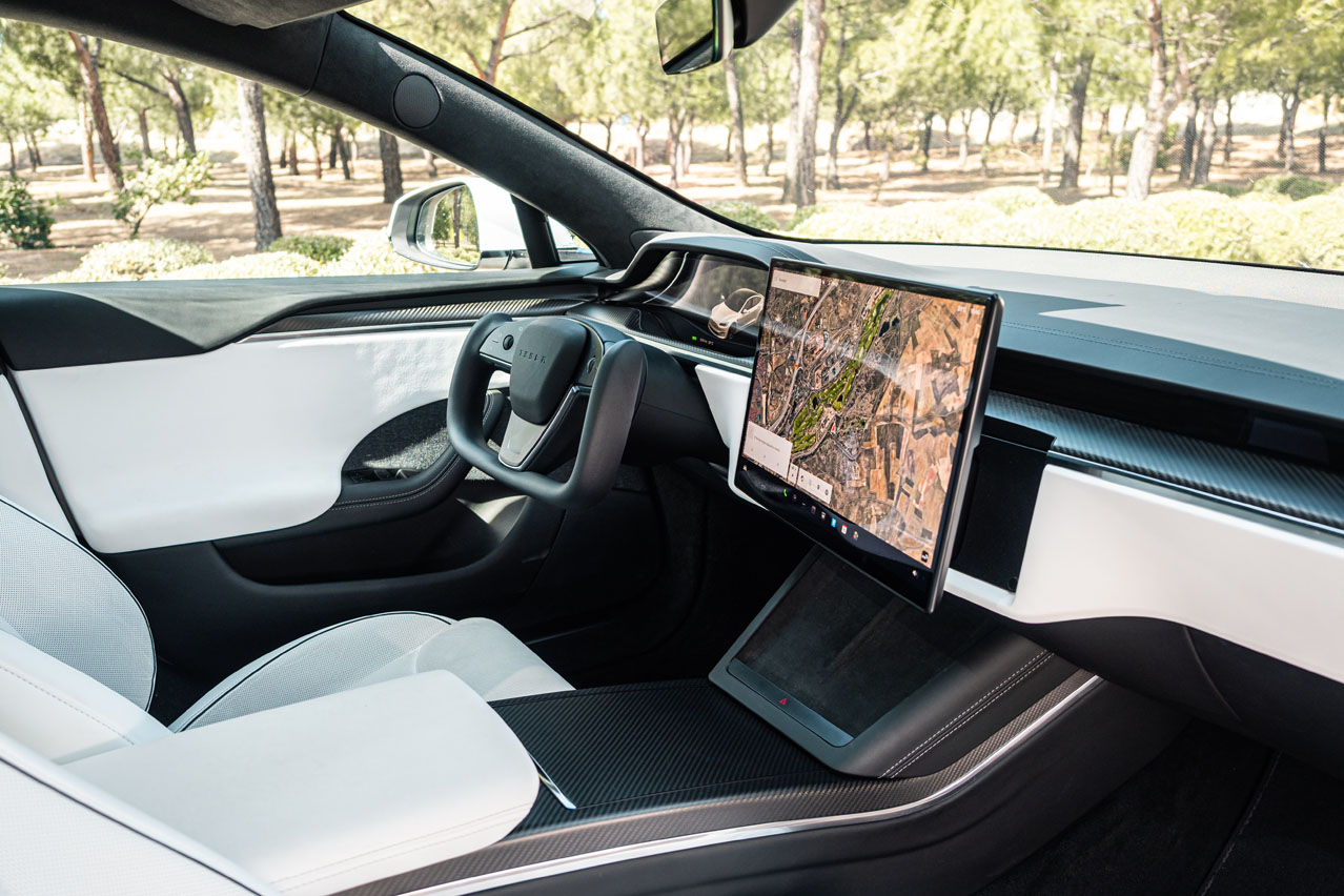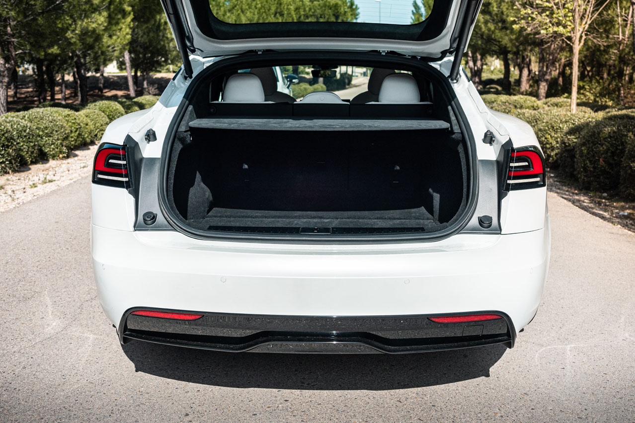 Complementan unas molduras de fibra de carbono, una tapicería de cuero de muy buena calidad y piel vuelta, que forra casi todo el habitáculo: techo, pilares e incluso la bandeja del maletero. No le faltan huecos portaobjetos, ni sus dos espacios para cargar de forma inalámbrica dos móviles, algo que vi por primera vez en el Tesla Model Y y que no he vuelto a ver en ningún otro modelo. Bien por Tesla. Y todo ello con unos ajustes muy buenos. Solo tienes que chequear el justísimo espacio que existe entre la luna y el techo. Otra cosa son los del exterior, porque no sé si se trata de esta unidad, pero el portón casa diferente con un lado y con el otro de la carrocería.