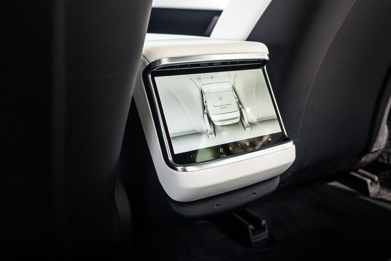 Y hablando de espacio, los pasajeros de la segunda fila tienen mucho espacio para las piernas y entre tres y cuatro dedos con mi 1,78 m para la cabeza, y eso que equipa techo panorámico. La central tiene una banqueta cómoda, pero el respaldo es duro. Lo bueno es que el piso es plano y que cuenta con una pantalla en la que puede/pueden controlar la climatización, pero también, como la frontal, navegar por Internet o jugar.