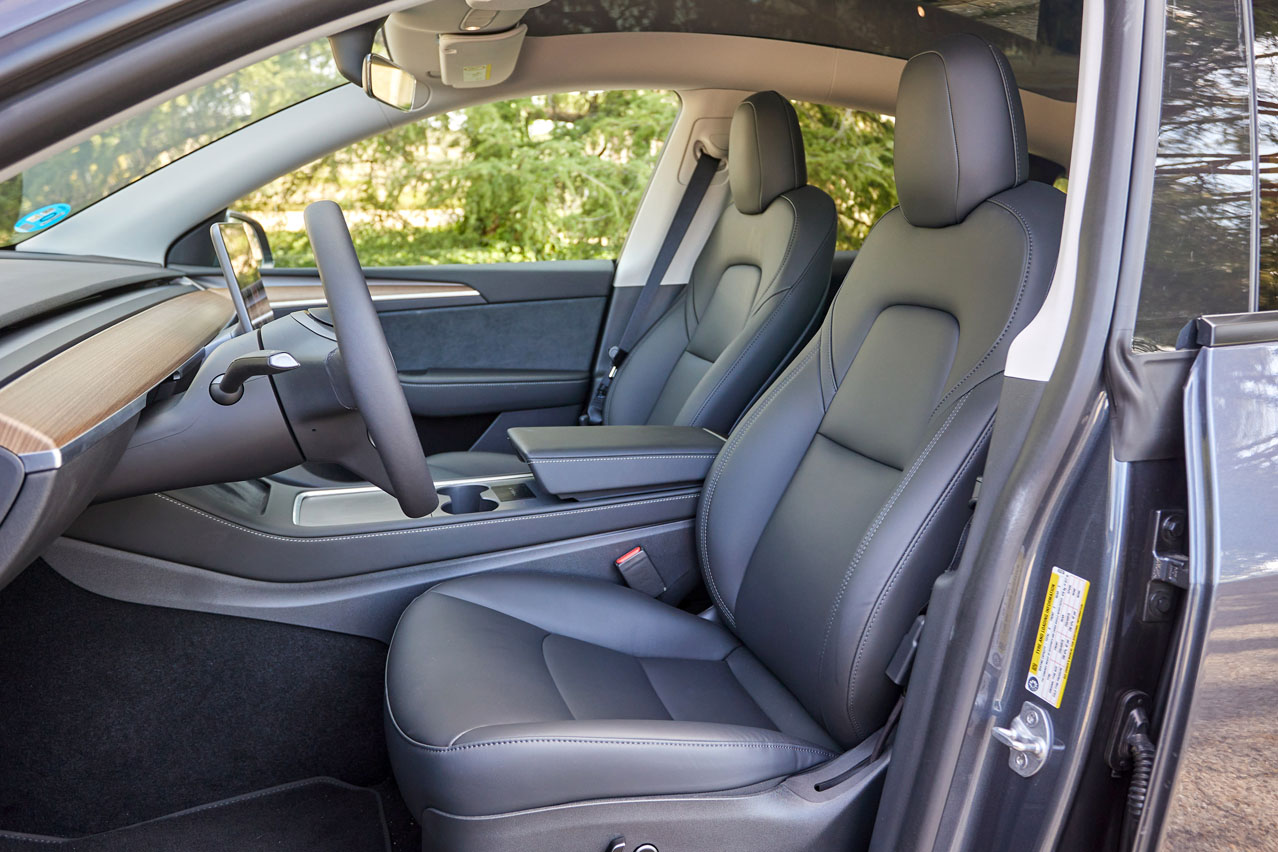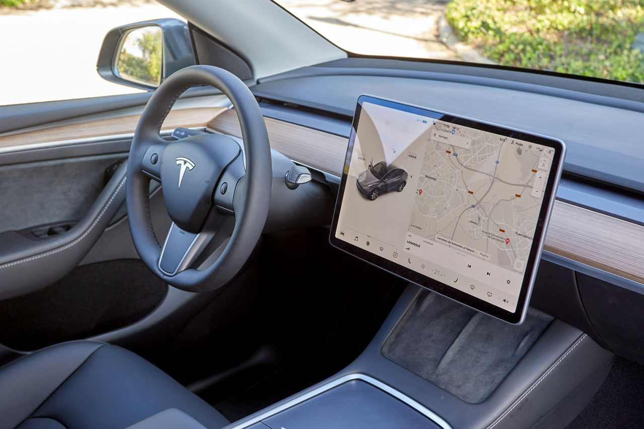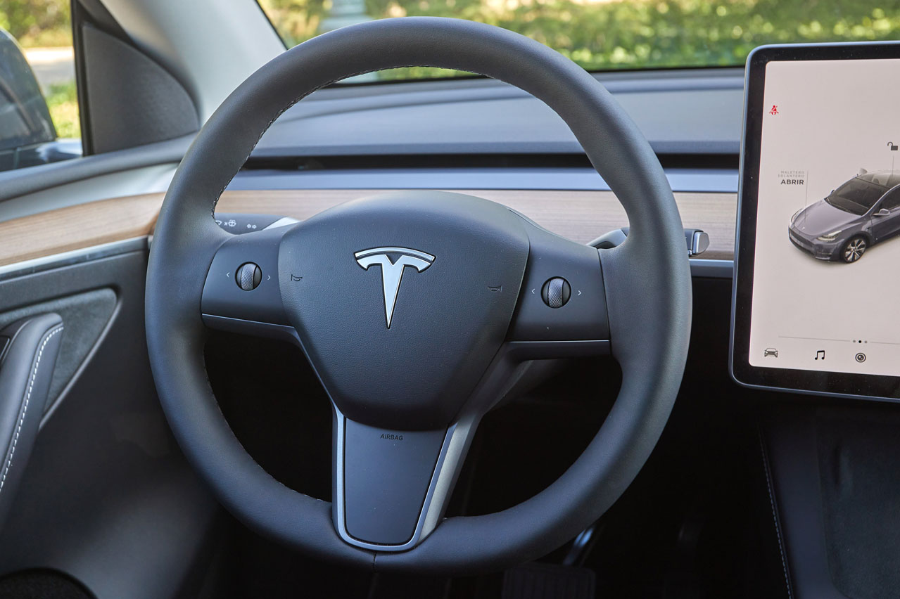 Los ajustes han mejorado bastante respecto a los modelos anteriores, y eso que esta unidad de pruebas está fabricada en China -las siguientes se producirán en la Gigafactory Berlin-Brandenburg, que comenzará a funcionar en diciembre-. Y la calidad percibida también se ha visto incrementada. Lo mismo ocurre al tocar los materiales del salpicadero y los paneles de las puertas, que en su gran mayoría son gomosos, y el volante, que tiene un grosor perfecto y un tacto agradable.