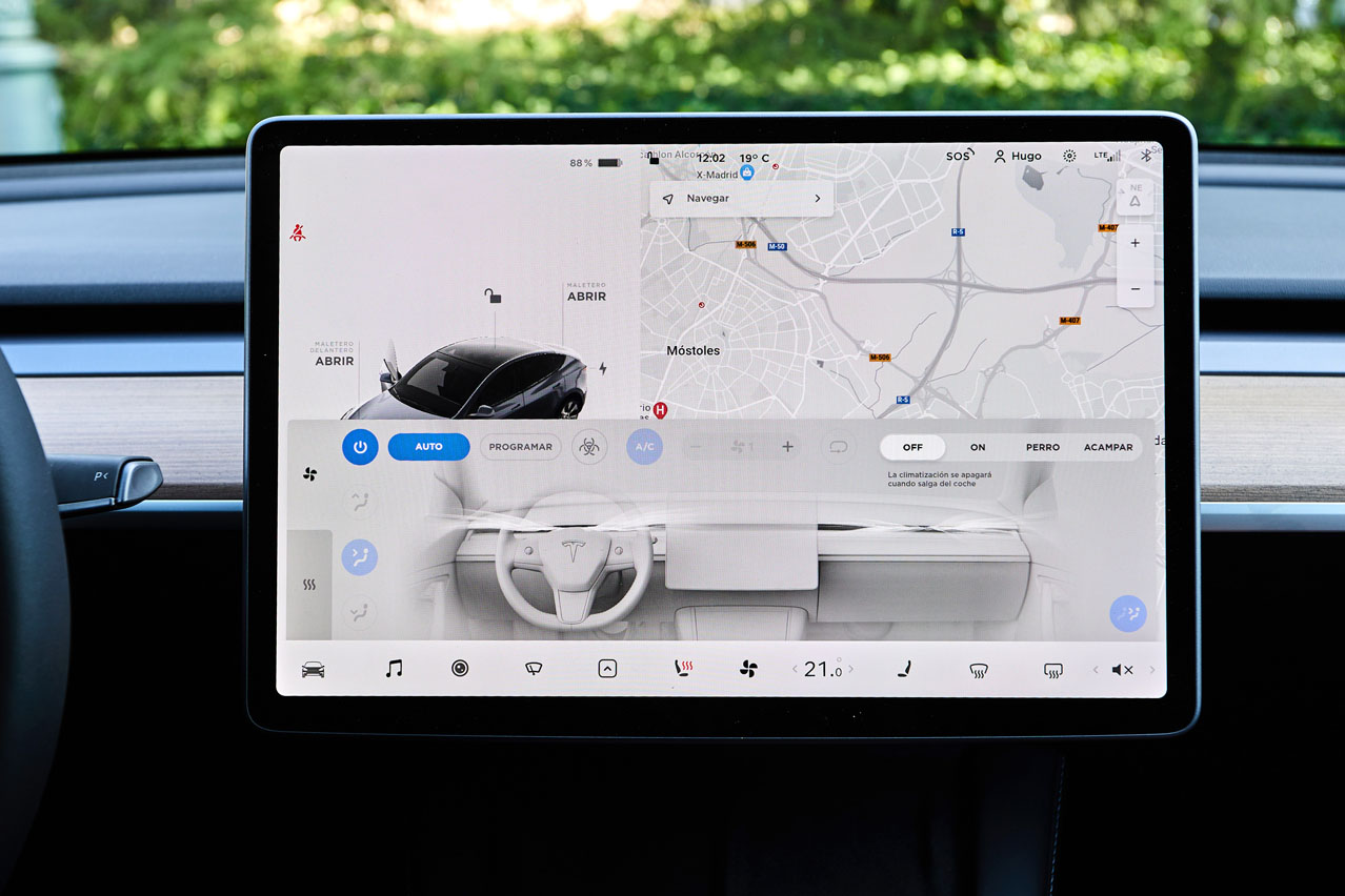 Lo que me choca al tratarse de un coche de 64.980 euros, que es su precio de partida -70.980 el Performance- es que no pueda equipar ni de forma opcional algún tipo de suspensión adaptativa. También que la paleta de colores sea más pequeña que la del Ford T -tiene cinco y próximamente llegarán dos más-. Pero lo que realmente me asombra es que un automóvil que quiere posicionarse como abanderado tecnológico no traiga head-up display, sobre todo al carecer de cuadro de instrumentos justo en frente del conductor y más aún cuando fabricantes como Volkswagen o Mercedes lo ofrecen incluso con realidad aumentada. Pero bueno, Tesla equipa videojuegos de todo tipo, una aplicación para crear música electrónica y otra para crear música de viento: vamos, lo que viene siendo pedos -por cierto, muy divertida-.