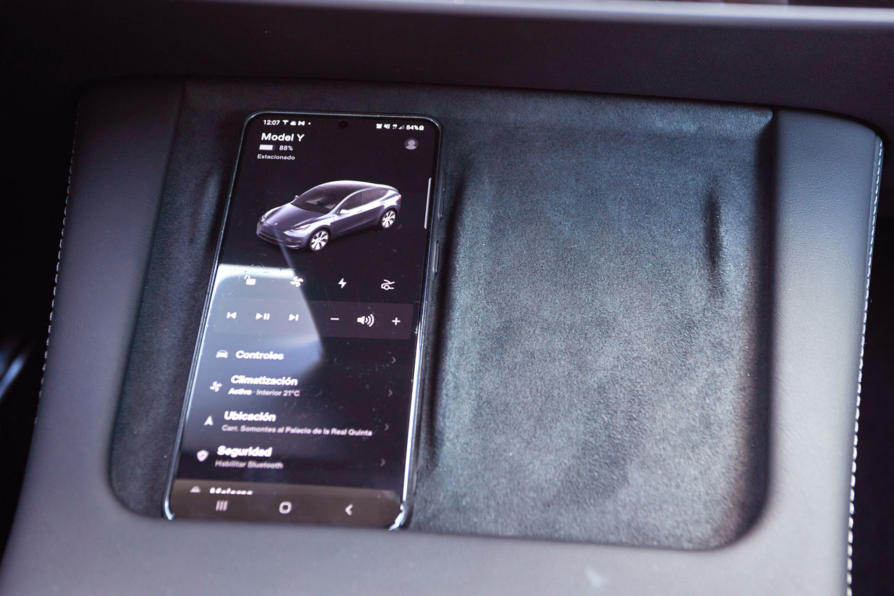 Los asientos son muy cómodos, tanto el respaldo como la banqueta, aunque para su desplazamiento tienes que pulsar un par de botones físicos... Vaya, analógico. Van tapizados en 'piel vegana', como lo denomina Tesla, aunque es piel sintética de toda la vida. También lo es la Alcantara que va en alguna zona de los paneles de las puertas y en la superficie donde se dejan los dos móviles, ¡dos! Es la primera vez que veo que un coche pueda cargar de forma inalámbrica un par de smartphone...