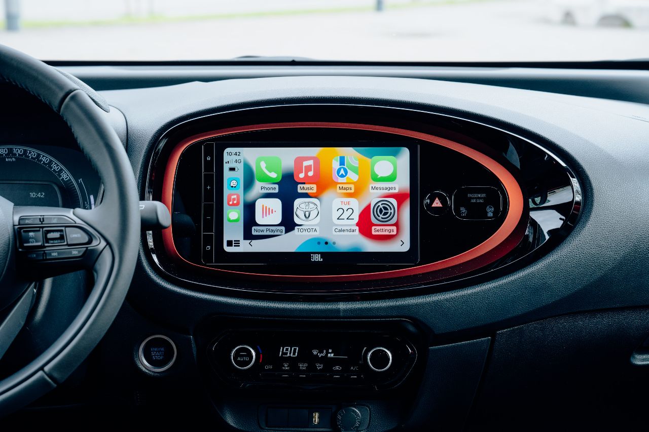 El interior del Toyota Aygo X Cross llama la atención desde el primer momento por su diseño. Un gran óvalo da cabida a la pantalla del sistema multimedia, que en sus versiones más avanzadas incluye el sistema Smart Connect con una pantalla táctil de 9 pulgadas, conexión a internet y conectividad inalámbrica Apple CarPlay y Android Auto.