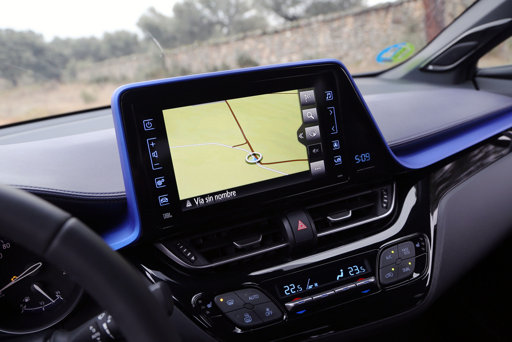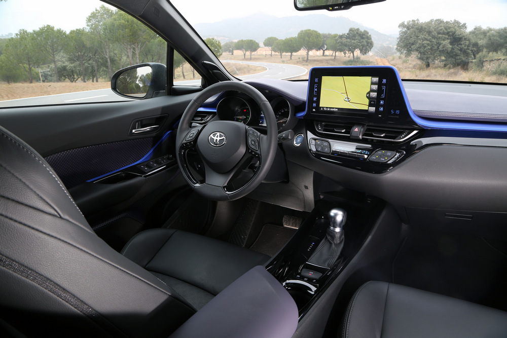 Pero el conjunto no estaría completo sin un habitáculo a la altura del exterior y en este sentido, el Toyota C-HR Dynamic Plus que pruebo no decepciona. Al abrir la puerta y sentarme en el asiento, cosa que no requiere prácticamente esfuerzo por la altura a la que este queda situado (ni alto ni bajo, aquí no tienes que escalar para acceder al habitáculo o descender para caer en el asiento), lo primero que llamó mi atención fue lo cómodo que me encontré y el llamativo aspecto del salpicadero. Este está orientado hacia el conductor, transmite una gran sensación de calidad y robustez y está coronado por una gran pantalla táctil de 8 pulgadas con el sistema Toyota Touch 2 & Go, que viene de serie en los tres acabados disponibles para el C-HR Hybrid: Active, Advance y Dynamic Plus.
