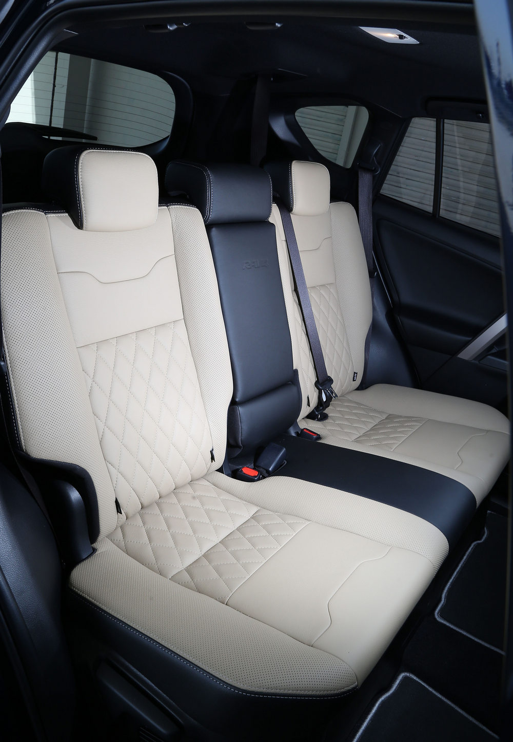 El Toyota RAV4 Feel! Edition de la prueba cuenta con cinco plazas, tres de ellas en la parte posterior, como suele ser habitual. Si bien, la tapicería en esta unidad, en un juego visual de diseño, ‘esconde’ una de ellas. La marca nipona juega con los colores beige y negro con el objetivo de aportar una visión más deportiva, porque visualmente, desde fuera, parece que el modelo es un 2+2 pero en realidad es un cinco plazas. ¿Por qué? Porque la plaza central de la bancada trasera es de color negro y aunque es sensiblemente del mismo tamaño que las otras dos, no lo parece. No te preocupes si eres alto, el espacio útil está pensando para que viajes de forma cómoda sin tener que rozar el techo. Cabe destacar que sus plazas traseras son de las más amplias del segmento SUV.