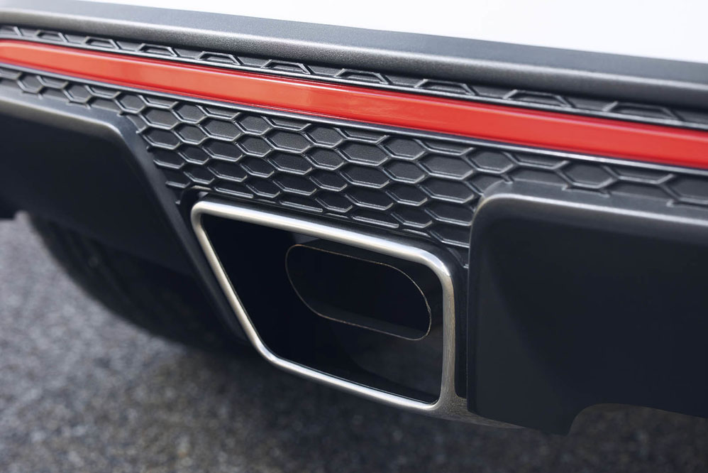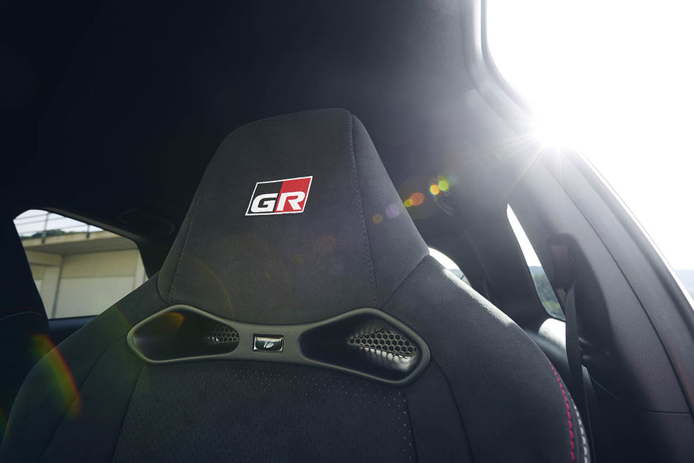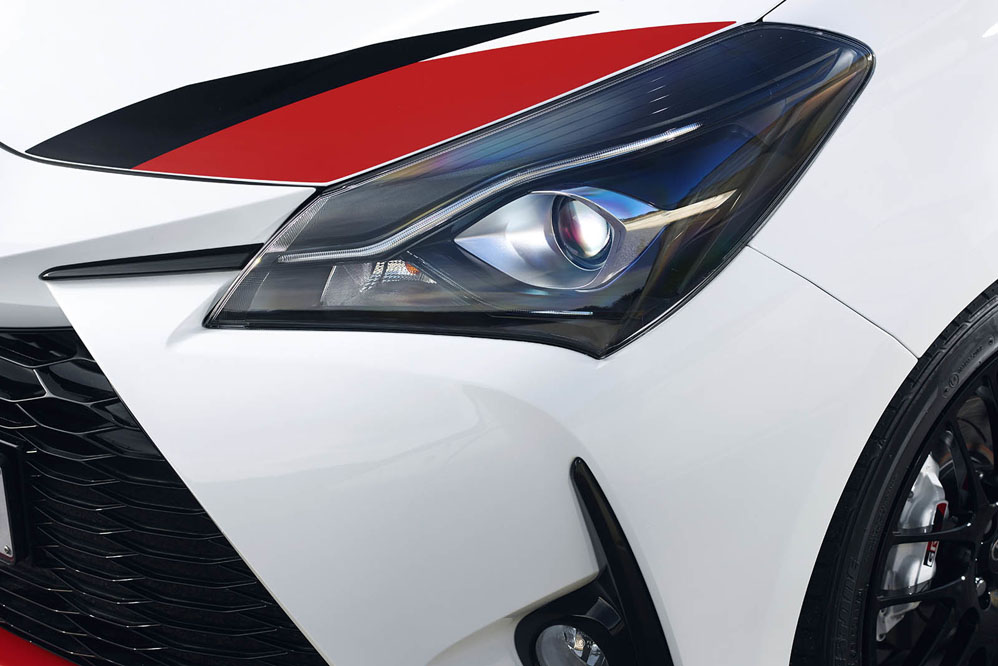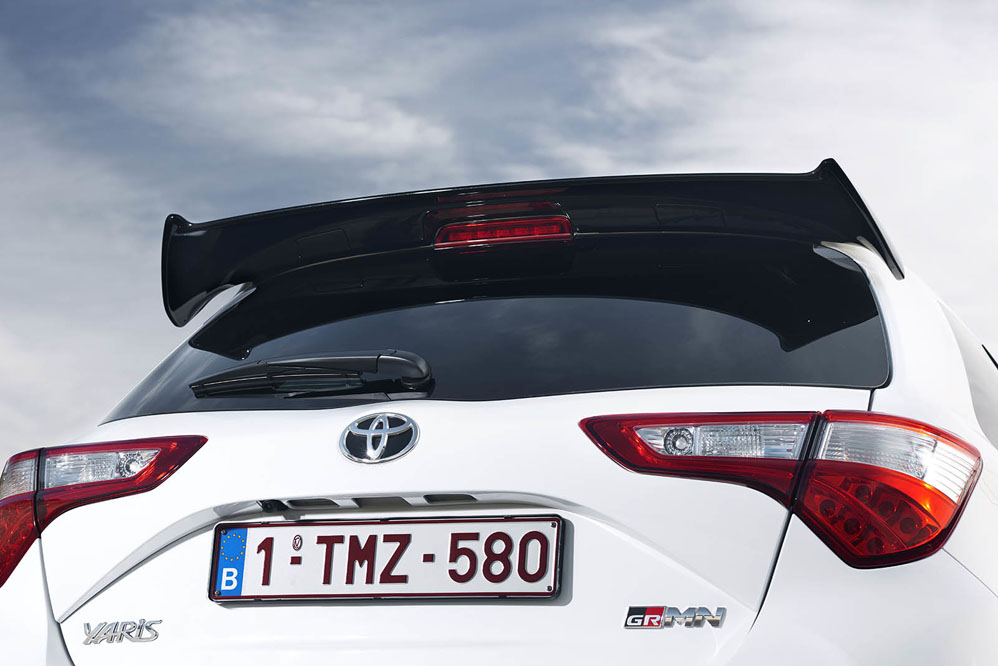 Equipa llantas forjadas BBS de 17 pulgadas bañadas en negro. Asimismo, el paragolpes delantero acoge una gran parrilla en negro brillante -misma tonalidad que el techo, la antena tipo aleta de tiburón y los retrovisores exteriores-, que tiene forma de panal de abeja. Por su parte, el trasero exhibe un escape trapezoidal en el centro inspirado en el Yaris WRC. No podía faltar un enorme alerón posterior y el difusor, y todo ello 'cocinado' en una carrocería de tres puertas… ¡Sí, tres puertas! Una rara avis en el mundo del motor. Segundo aplauso para la firma.