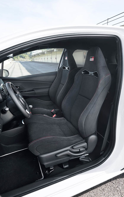 Obviamente, la marca también ha trabajado en el chasis, que ha sido reforzado, y eso, también desde el primer momento, se nota. Sujeto por los soportes del asiento, afronto las curvas con total facilidad, pero también con la confianza que me ha dado el coche en los primeros virajes. Los amortiguadores deportivos Sachs Performance hacen que doble casi plano, y el diferencial autoblocante mecánico tipo Torsen, que el Toyota Yaris GRMN durante la prueba, a pesar de ser un tracción delantera de bastante potencia, no subvire ni sufra pérdidas de potencia a la salida de las curvas. También influyen, claro está, los Bridgestone Potenza que enfunda. De la dirección, con nuevo software, y de los frenos, de discos rayados y pinzas Advics de cuatro pistones, nada que objetar.