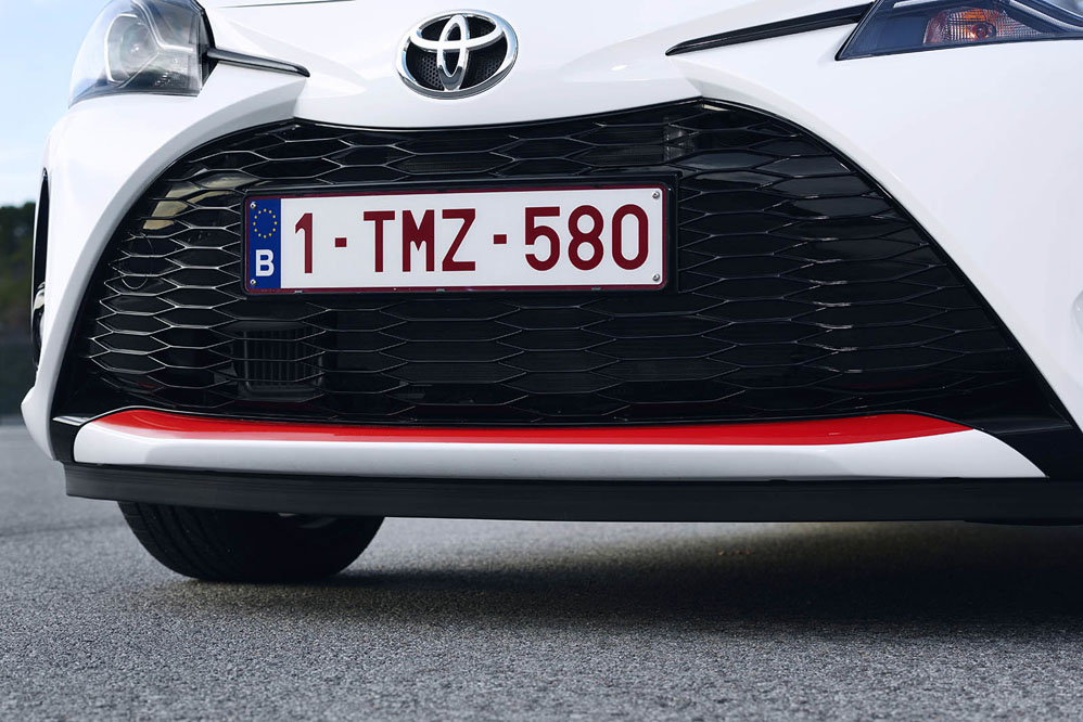 Soy de los pocos afortunados que puedo mirarlo de tú a tú. Más afortunado aún por poder probarlo, porque sólo han llegado a España siete unidades, todas vendidas, por cierto, del Yaris GRMN. Enfrente tengo una de ellas. Su aspecto deportivo entra por los ojos, conquista. Siempre mantengo que un coche deportivo debe portar una imagen que lo parezca, y el pequeño GRMN lo consigue. Primer aplauso para Toyota. Los colores de Gazoo Racing, rojo, blanco y negro, se imprimen en la carrocería mediante la pintura y una serie de adhesivos.