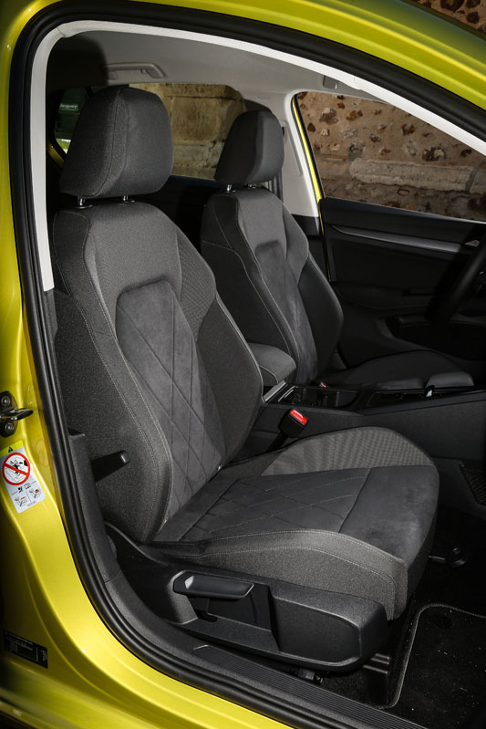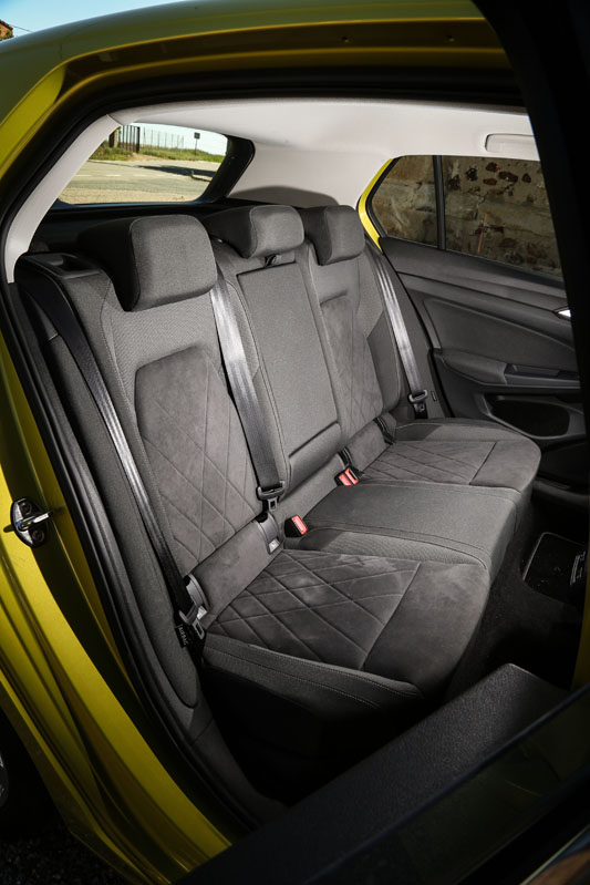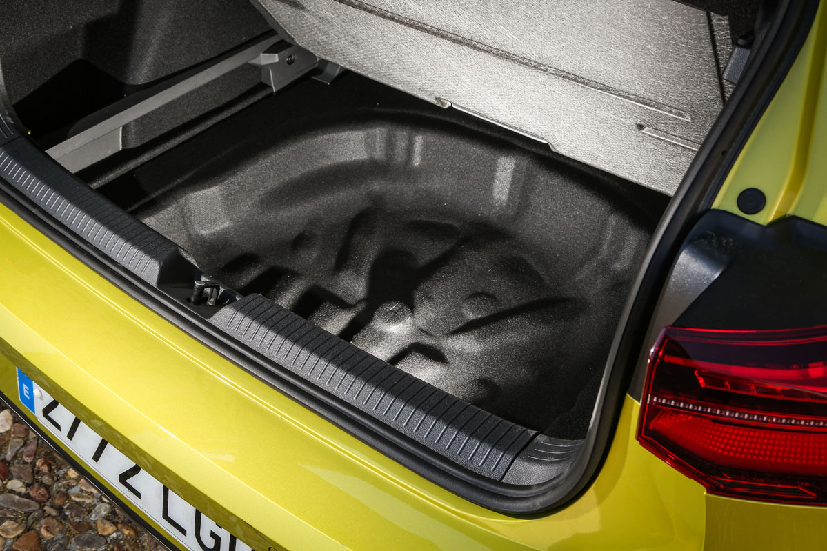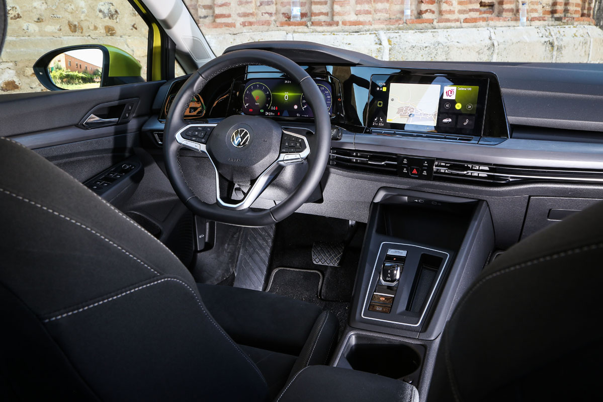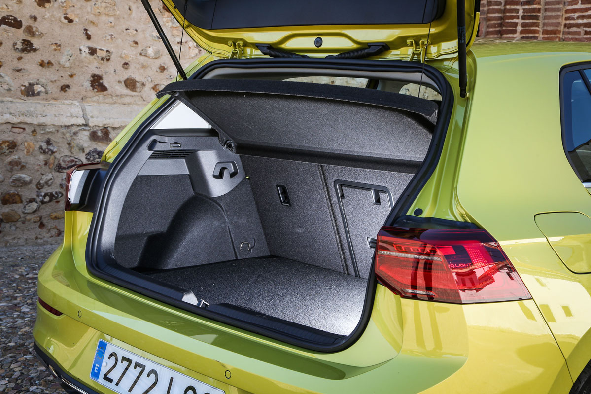 La octava generación del Golf es más larga, pero más estrecha y baja -4,28, 1,79 y 1,46 metros, respectivamente-. Estas nuevas cotas siguen ofreciendo uno de los habitáculos más espaciosos del segmento. Son seis los dedos los que separan mi cabeza de rozar con el techo y otros seis, mis rodillas con el asiento delantero. En medio de la tabla se queda el espacio de carga, que cubica 380 litros, la misma cifra que el modelo previo. No le voy a echar la culpa a la batería del sistema mild hybrid, porque ésta se sitúa debajo del asiento de acompañante y no en el maletero.