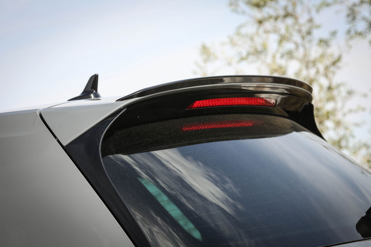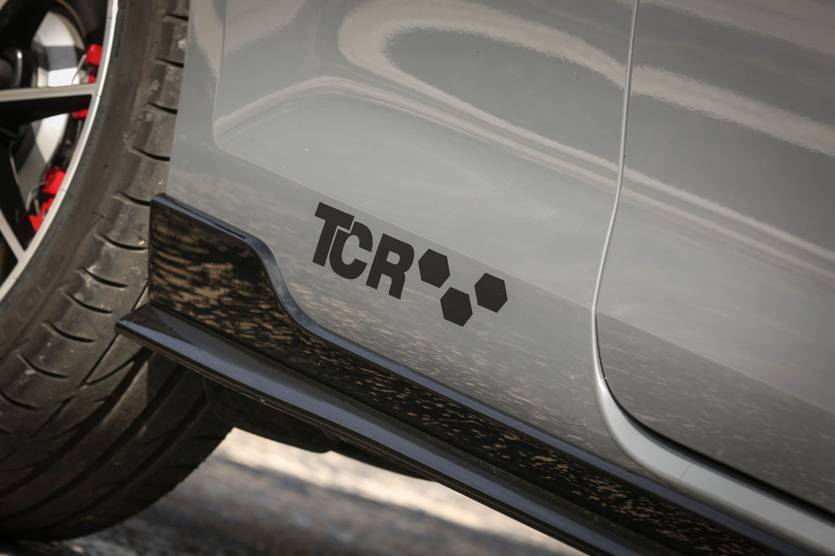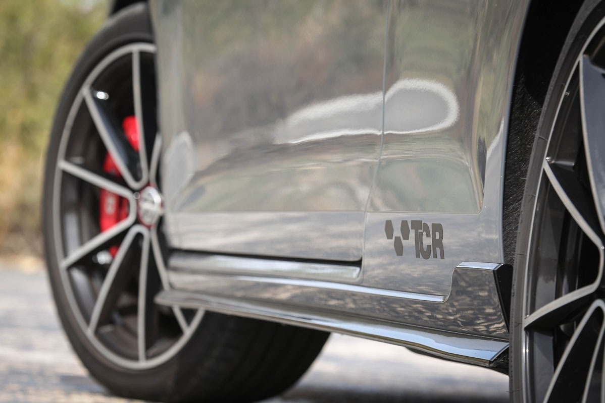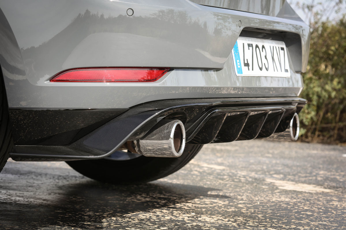 Pero, primero, permíteme que eche un vistazo a su exterior. ¡Tremendo! Lo que me ha parecido más sugerente son su difusor traseros y su splitter frontal, mucho más radicales, llamativos y que sobresalen de la carrocería. Tampoco pasan desapercibidos los retrovisores en negro, las taloneras, el alerón de techo específico y las llantas Belvedere de 18 pulgadas. Dados los tiempos que corren, su tamaño puede parecer justo. Si con ellas no te conformas, tienes llantas de 19 pulgadas Reifnitz en negro mate o las Pretoria, también de 19, en negro brillo con neumáticos semislick. Las primeras vienen incluidas en un paquete que cuesta 1.305 euros y que, además, añade suspensión posterior recalibrada y dirección progresiva. Las segundas, por 2.170 euros y el mismo equipamiento anterior. Marida este apetecible conjunto unos frenos de disco delanteros perforados y flotantes y el color exclusivo Gris Puro con vinilos decorativos de color negro. Lámame loco, pero me atrevería a decir que el Volkswagen Golf GTI TCR gana al Golf R en aspecto deportivo.