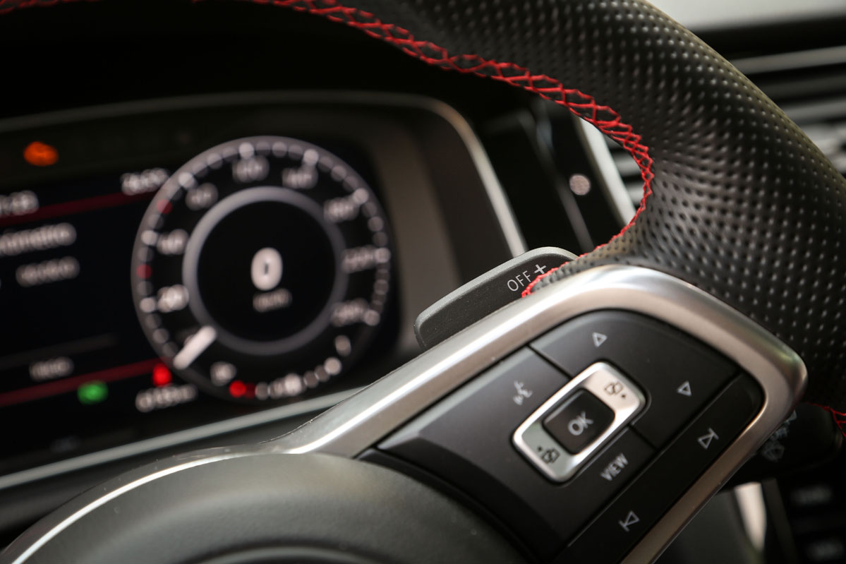 Dentro va a la par. El tapizado es único de esta versión. También el volante se diferencia de los del resto de la gama por la guía central en color rojo que adopta. Buenos materiales y ajustes para este coche que gracias a su cuadro de instrumentos digital de 12,3" y a la enorme pantalla del sistema de infoentretenimiento, la calidad percibida es muy alta. Como buen deportivo no falta la Alcantara, que es la encargada de recubrir los paneles de las puertas y parte de los asientos, que también recogen costuras en color rojo.