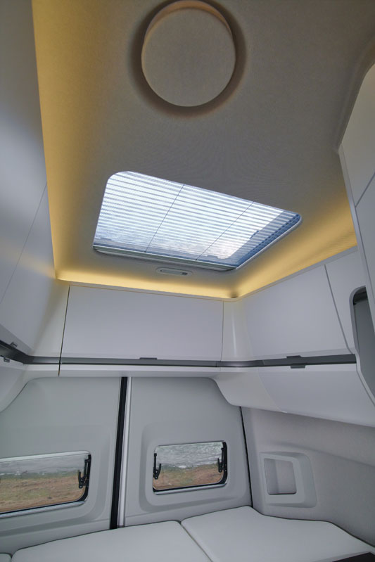Una vez en marcha, lo cierto es que el puesto de conducción es una gozada. La postura al volante es erguida y casi perfecta, los pedales quedan muy bajos para que los pises casi sin esfuerzo y la fatiga sea mínima con el paso de los kilómetros (recuerda que esto está pensado para hacer muuuuchos). El asiento incluye de serie un montón de reglajes mecánicos y eléctricos para estar muchas horas ahí, tanto en marcha como al girarlo para que sea parte del mobiliario, junto a la mesa plegable que tienes detrás, al lado de la banqueta de dos asientos que hay para los pasajeros (este vehículo está homologado para 4 plazas).