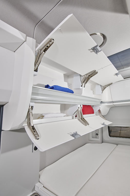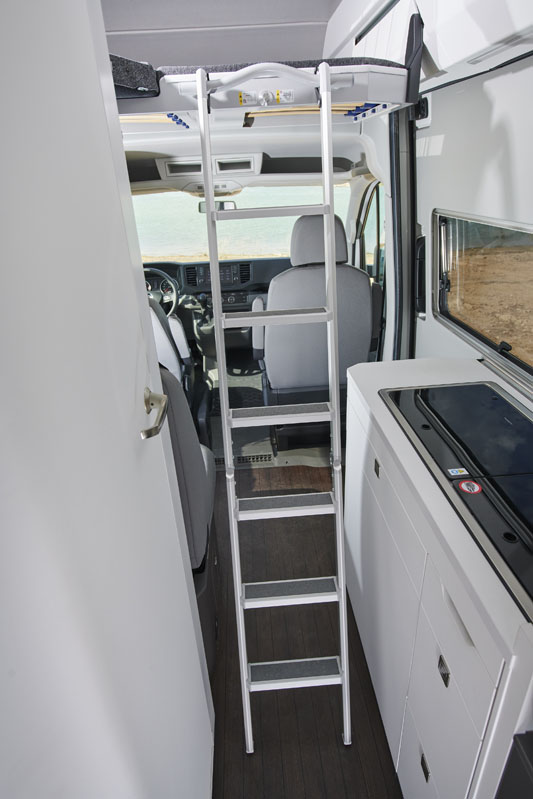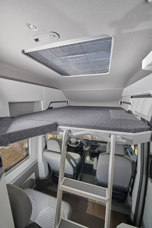 Y lo mejor para los adultos -especialmente, si mides 1,90 m como yo-: el momento de amortizar la altura de la VW Grand California 600. Puedes caminar totalmente erguido desde el puesto de conducción hasta la cama principal (en la zaga, sobre el maletero), sin dolores de espalda y sin sensación de claustrofobia, por muy mal tiempo que haga. Esta configuración también permite alojar una segunda cama -de serie- en la parte superior, que además se despliega de noche hacia la zona central en un sólo movimiento y cuenta con una escalerilla, hueco que hace las veces de mesilla de noche -como en la otra cama-, tomas USB para conectar móviles, portátiles o tabletas, luces de LED (como en todo el perímetro habitacional)… Está más pensada para niños que para adultos, aunque he podido dormir allí sin problemas en diagonal, con cierto cuidado, eso sí, de no estirar los brazos hacia arriba y dañar la cortinilla de la ventana (que también es mosquitera y da paso a una apertura totalmente practicable, igual que en baño y parte posterior, mediante manivelas escamoteables).