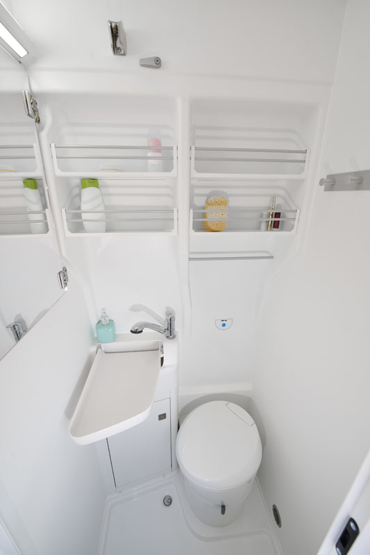 Y para darle más autonomía al conjunto (algo especialmente importante en tiempos de coronavirus), entre los dos asientos para pasajeros (con cinturón, reposacabezas, isofix y acceso inferior a la calefacción autónoma en esta unidad -un poco incómoda de regular al estar tan abajo-) y la cama principal, tienes un baño completo, con WC químico, espejo, baldas y percheros, lavabo plegable y grifo con manguera extraíble que hace las veces de ducha (con agua fría y caliente). ¿Quién da más?