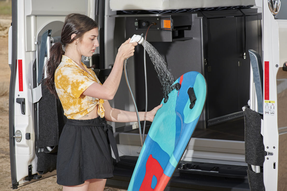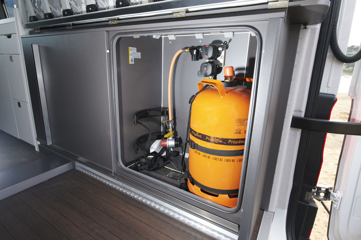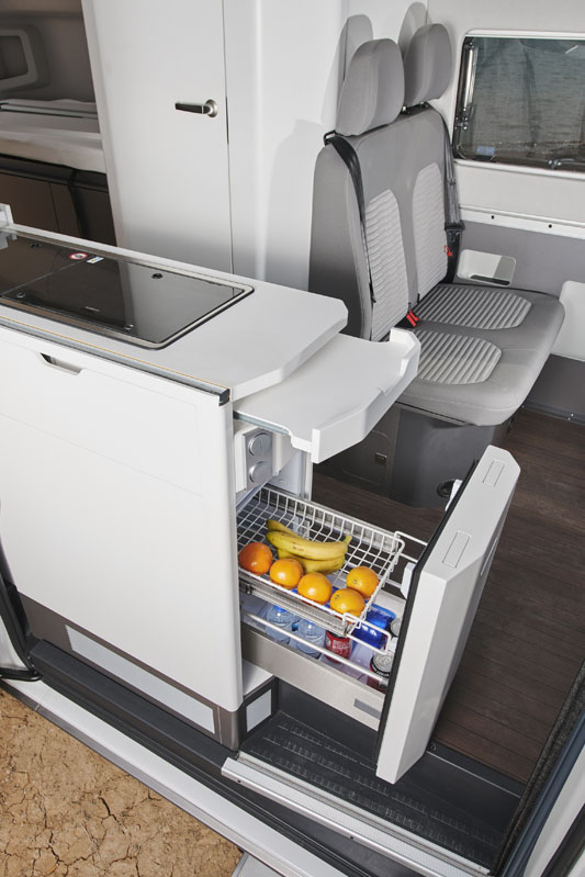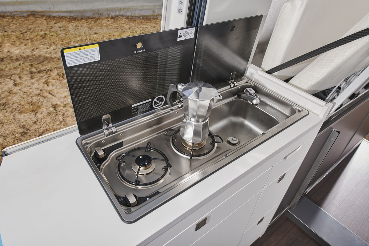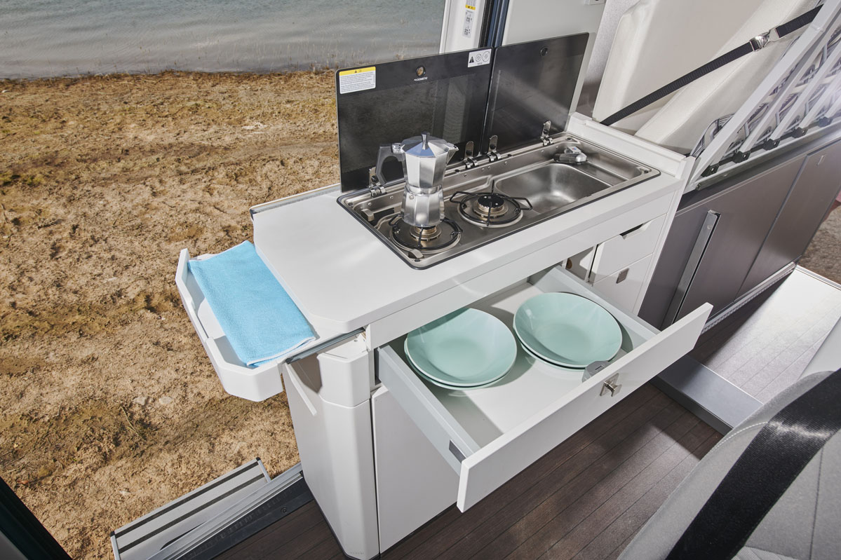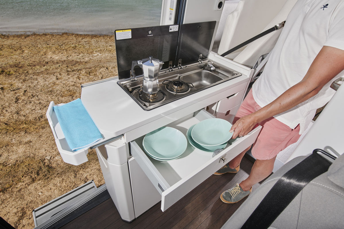 El mueble de la cocina resta muy poco espacio e incluye de serie dos fuegos alimentados por gas, fregadero con grifo extraíble de agua fría y caliente, la nevera con congelador que hemos mencionado -con interruptores de apagado y de luz, para evitar que suene el motorcillo si no vas a usarla-, encimera, cajones, tomas de corriente exteriores para abrir la puerta corredera y hacer vida en el exterior -con la mesa de dentro, el toldo y las sillas plegables que hay en las puertas traseras (todo igualmente, de serie)-…
