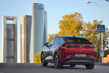 tres cuartos trasero del Volkswagen ID.5 Pro Performance 204 CV 77 kWh frente a las cuatro torres del Paseo de la Castellana de Madrid.
