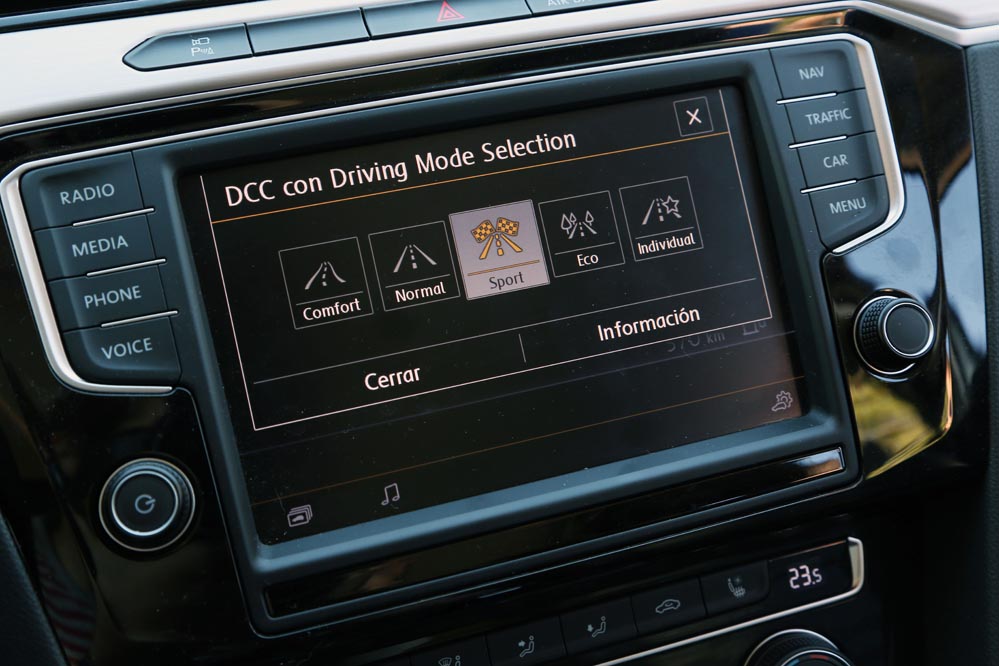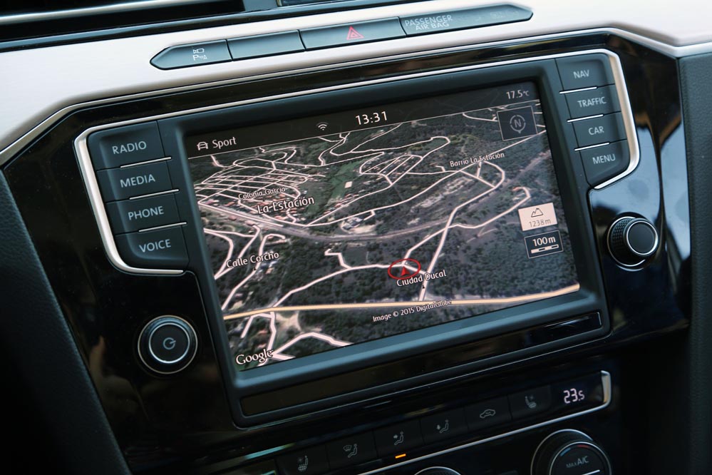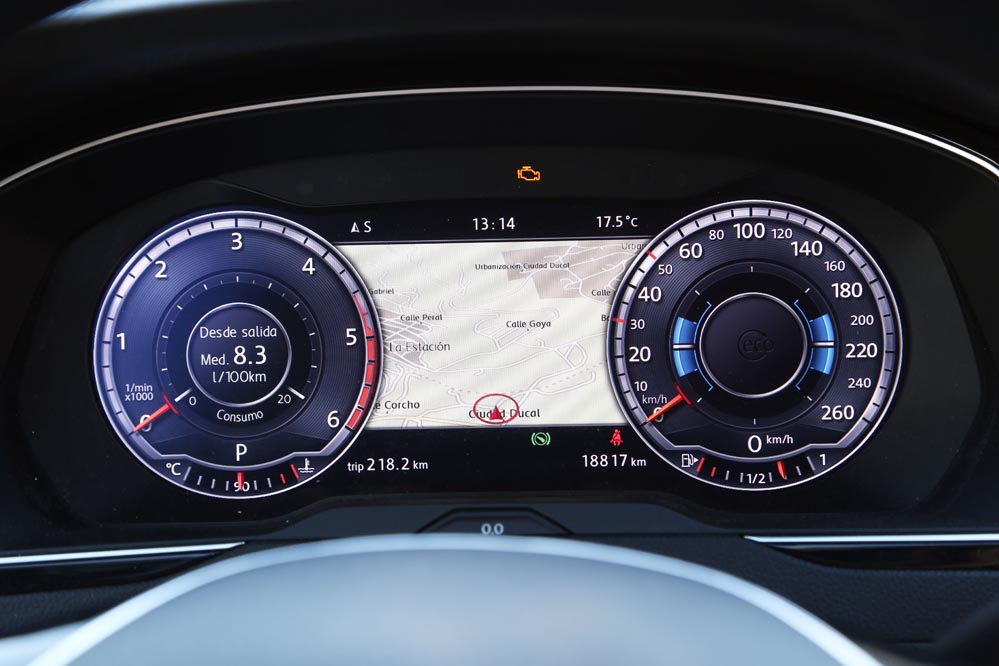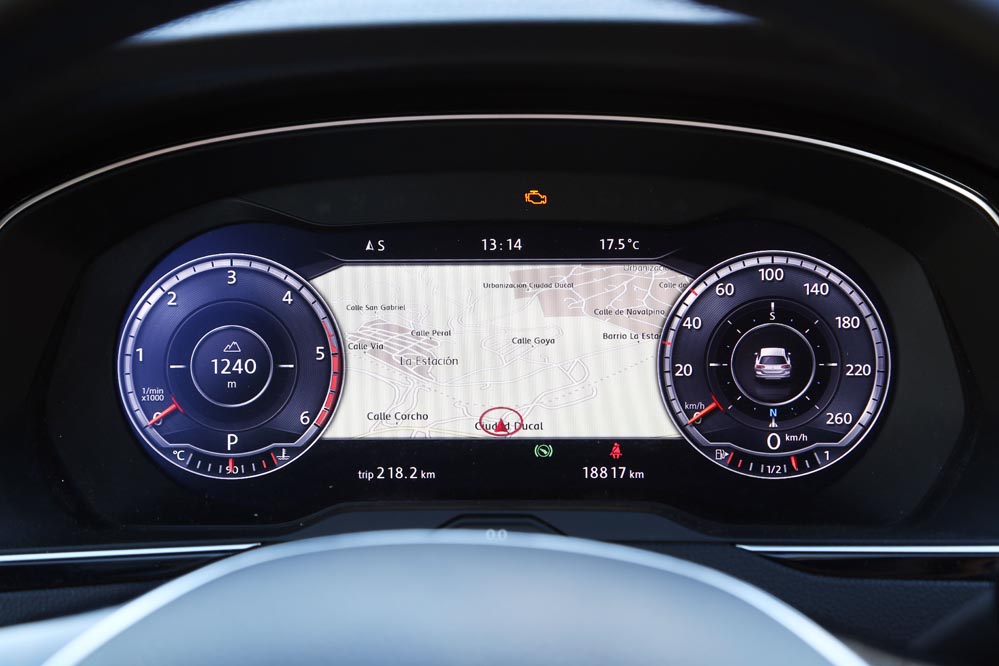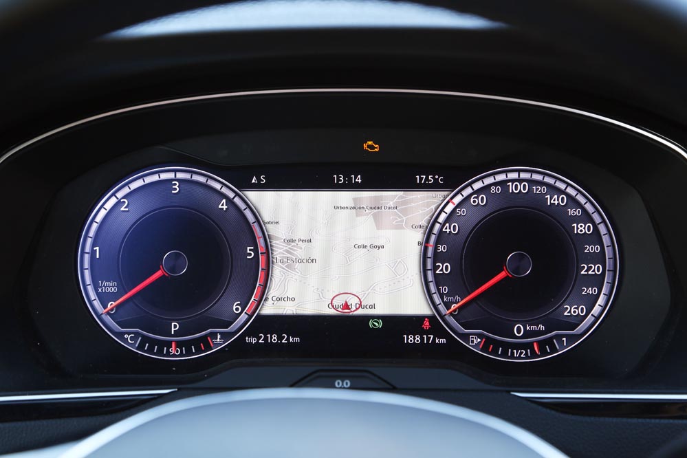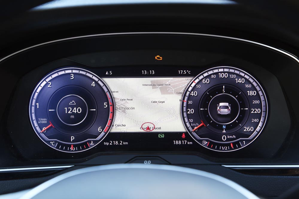 Es curioso, porque estoy ante el modelo más potente de la gama: un dos litros biturbo diésel que entrega 240 CV y un cambio automático DSG de 7 velocidades para gestionarlo con eficacia. Aun así, cuando me pongo al volante, este coche no me incita a exprimirlo, sino a hacer kilómetros y kilómetros sin el estrés al que estoy habituado. A esto ayuda, sin duda, un habitáculo amplio y equipado hasta los topes que refuerza el excelente confort de marcha y cuya factura recuerda a modelos más premium. Uno de los elementos que más me han llamado la atención (de serie en esta versión) es el llamativo cuadro de mandos con pantalla digital HD de 12,3″, configurable de mil maneras. Es verdad que un cuadro de mandos analógico ofrece lo esencial por bastante menos dinero, pero no es menos cierto que este tipo de detalles suelen encandilar a los conductores y forma parte de los elementos diferenciadores de unos coches frente a otros o, lo que es lo mismo: “mira lo que tiene el coche de mi vecino…” Aunque, pensándolo bien, además de fardar del display digital de 12,3″ HD, hay una característica que, por lo menos en mi caso, me sirve de bastante ayuda: poder consultar la ruta del navegador a la altura del propio cuadro, sin tener que desplazar mi mirada a la consola central. Esto añade un plus de seguridad muy importante teniendo en cuenta la problemática de las distracciones al volante.