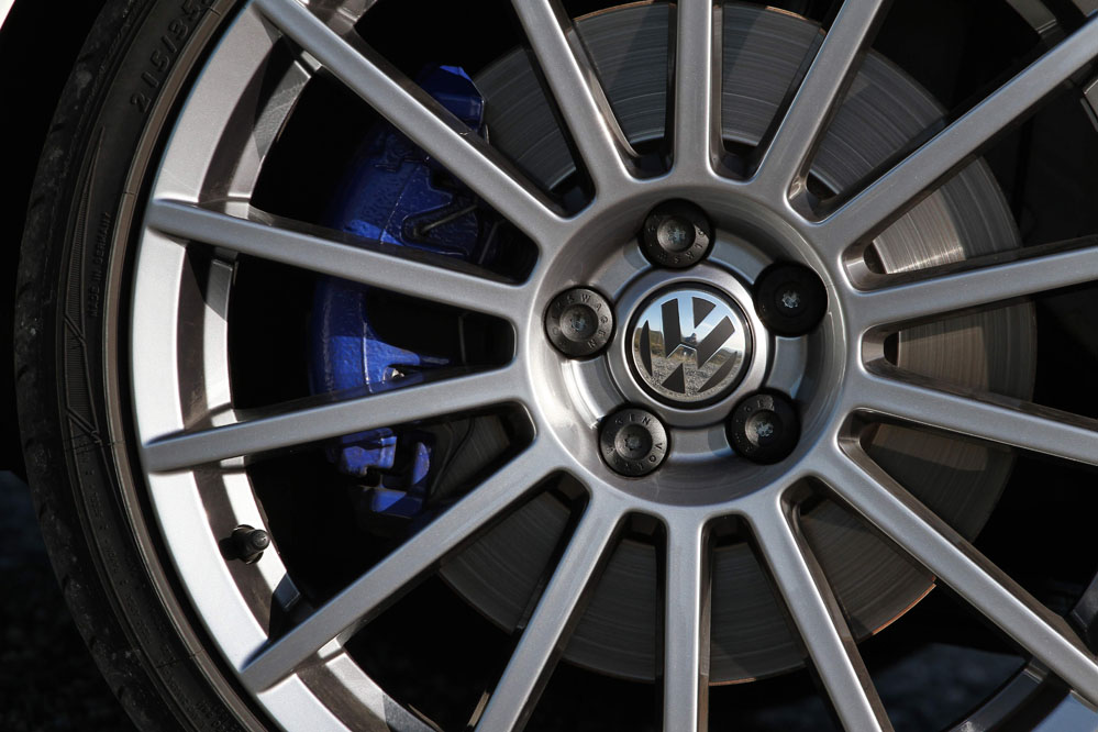 En el primer vistazo que me regalan mis ojos ya sé que este Polo no es un coche cualquiera. Este WRC R, que es bastante más grande que el primer Golf GTI, ‘viste’ una pintura blanca con vinilos azules y plateados, colores de Volkswagen Motorsport; paragolpes delantero con amplias tomas de refrigeración y trasero con difusor, llantas de aleación ‘Cagliari’ de 18 pulgadas, que esconden pinzas de freno azules; inscripción R en la parrilla delantera y WRC en los laterales, y spoiler trasero en negro brillante con el número de serie impreso. Lo cierto es que el Polo WRC no oculta su origen...