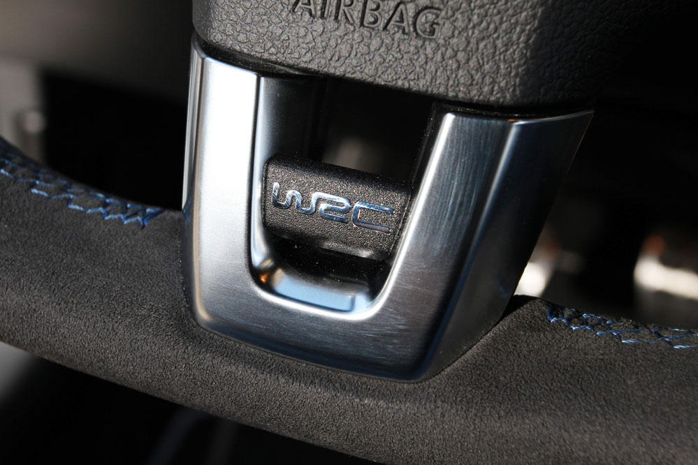 Dentro también hay detalles exclusivos como las agujas del cuadro en azul, el volante en piel vuelta con guía central y achatado por la parte inferior, que sigo sin ver las virtudes de esta forma tan poco práctica; y los asientos realizados en el mismo material, aunque se echa en falta aditamentos algo más deportivos, falta que, obviamente, no se solventa con el logo WRC en la palanca de cambios.