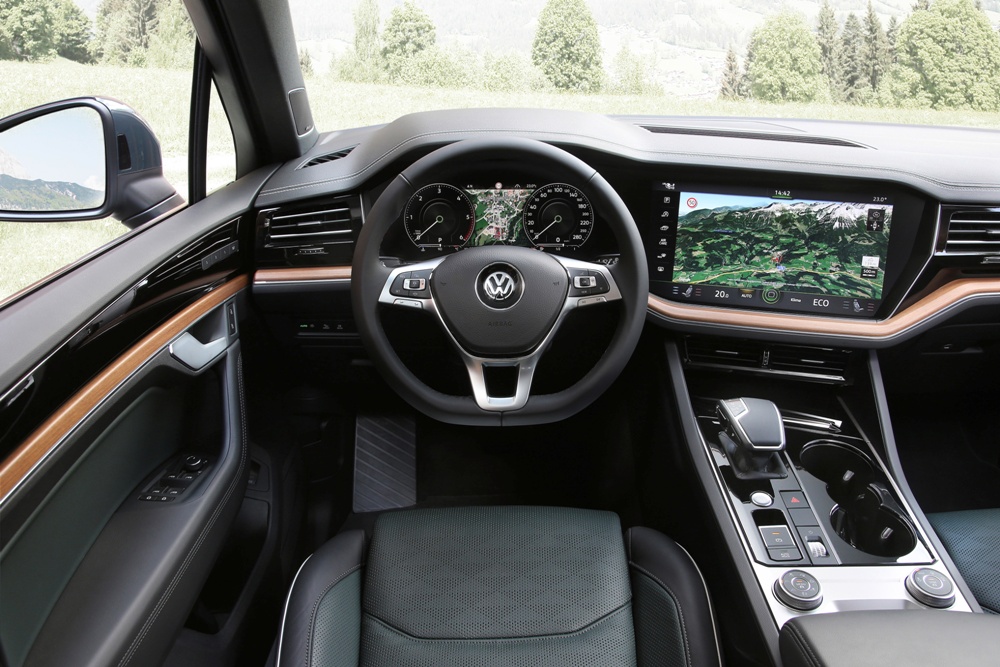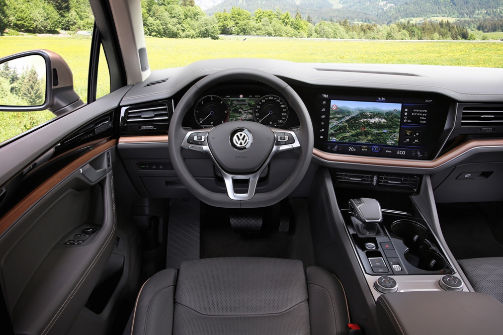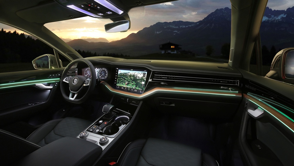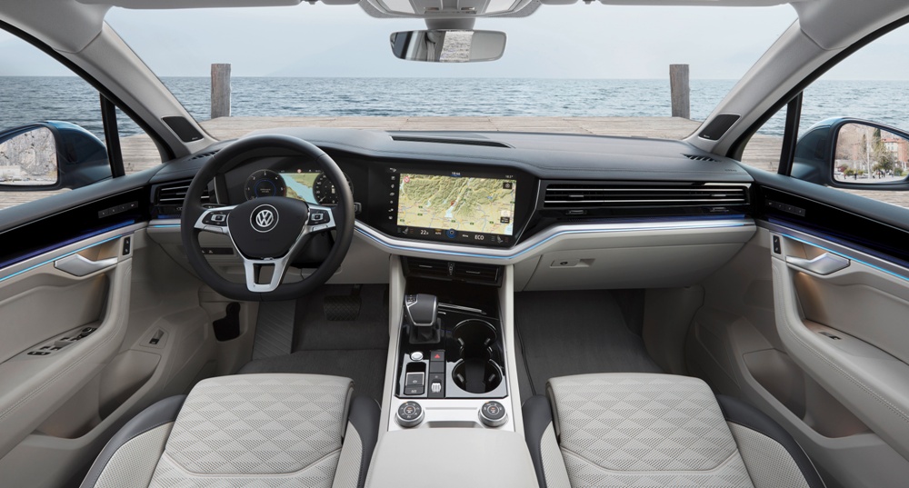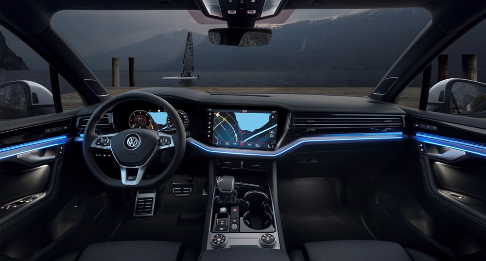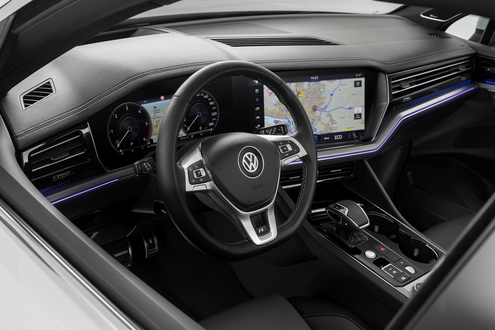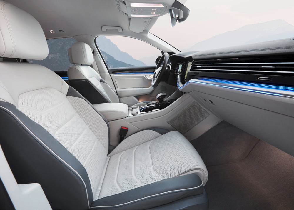 Disponible en tres líneas de equipamiento opcional –Atmosphere, Elegance y Black R-Line- que se suman a los acabados básicos Pure, Premium y R-Line, el nuevo Touareg se hace con asientos con función masaje con ocho programas para elegir y múltiples ajustes eléctricos, mientras que los asientos traseros variables se pueden abatir e incluso desplazarse longitudinalmente hasta en 160 mm. El techo corredizo panorámico y el sistema de luz ambiental en 30 colores están acompañados de una selección de cueros y pieles para asientos, salpicadero y paneles de las puertas.