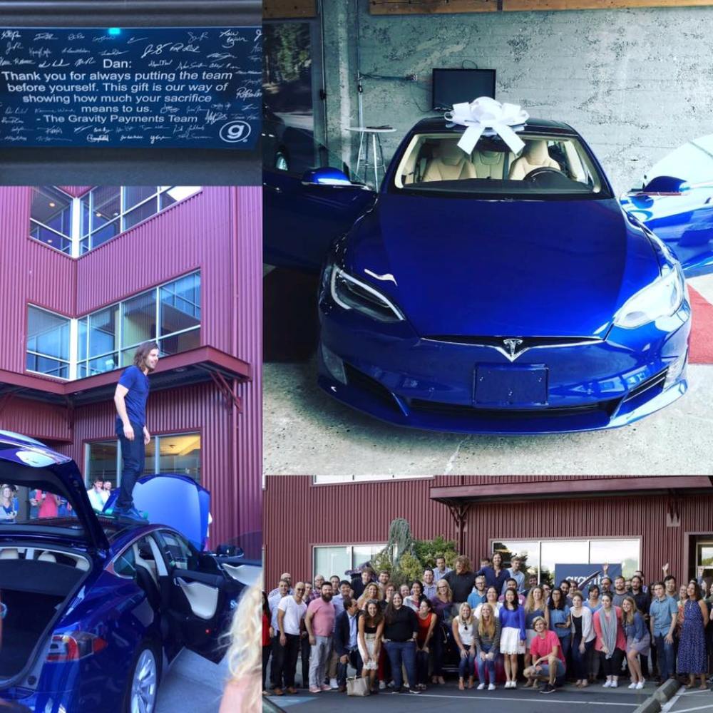 Por si esto no fuera suficiente, Price renunció a un salario de más de un millón de dólares para poder doblar el sueldo a sus empleados, entre los que se incluye con la misma cifra anual. Es por ello que los empleados de la compañía decidieron ahorrar durante seis meses para regalar a su jefe el coche de sus sueños, un Tesla Model S valorado en 70.000 dólares.