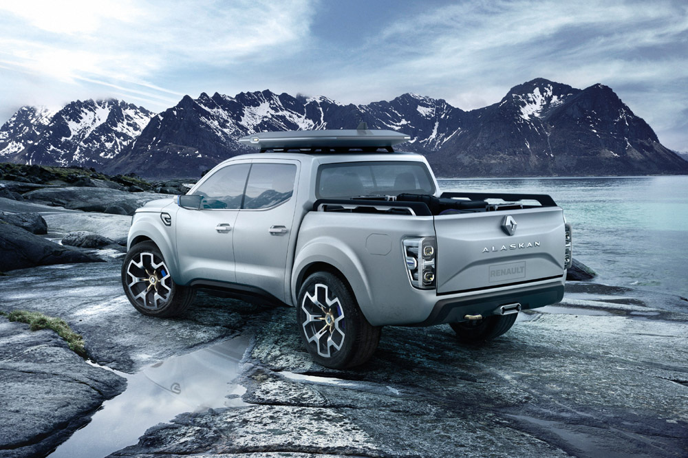 Según la firma del rombo, el nuevo pick-up Alaskan Concept combina las características estéticas de los últimos productos que han lanzado al mercado con los rasgos propios de un pick-up. El resultado es un vehículo de imagen robusta, musculosa y dinámica, con un frontal dominado por el logotipo de la marca y una zaga que cuenta con unos llamativos faros con tecnología LED y una generosa salida de escape en posición central -pero imaginamos que la ubicación del escape cambiará en la versión de producción-.