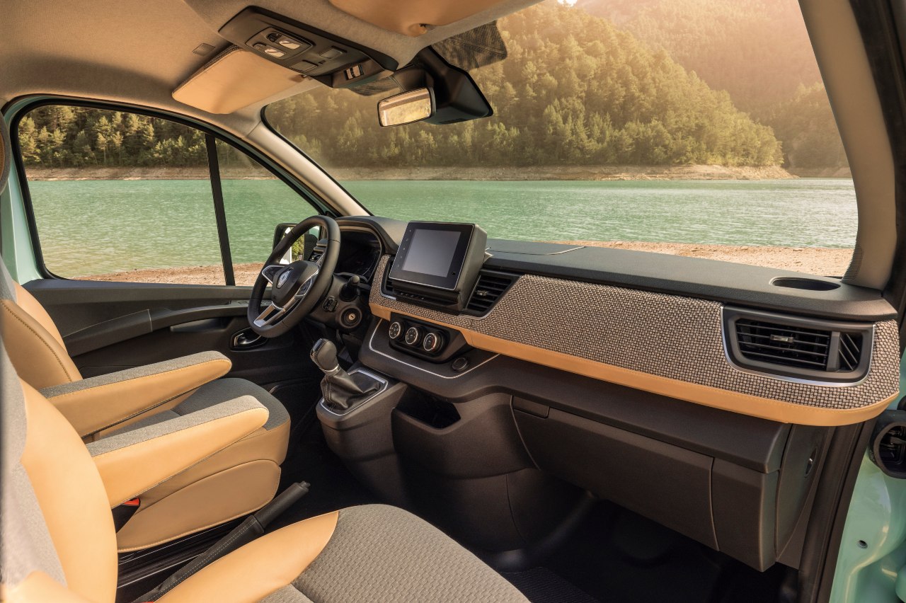 ¿Y cómo hacer para unirlos? Pues Renault parece tener unas cuantas ideas. Por de pronto, el prototipo se basa en la nueva Trafic, en versión eléctrica (se supone que habrá una en un futuro próximo) y con carrocería bitono. La cabina y la zona de carga (convertida en una auténtica habitación de hotel) están completamente separadas, tanto física como estéticamente. Pues, mientras la primera está pintada en un color verde aguamarina llamado 'Almond Flakes', la segunda se viste con un gris denominado 'Anodised Silver'.