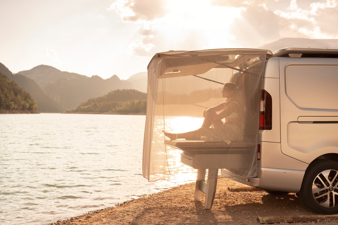 El segundo es que el sofá-cama se mueve. Imaginamos que sobre unos raíles, aunque el fabricante francés no especifica demasiado. De forma que puede colocarse tanto dentro de la camper por completo como parcialmente fuera, con el portón trasero abierto. En esta que ellos llaman la 'posición de contemplación', vemos unas cortinas como de cama balinesa, para dar algo de privacidad al ocupante.