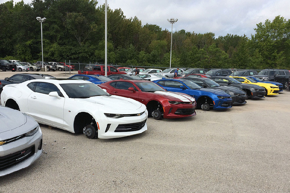 Como el robo de los 48 juegos completos de llantas se produjo de madrugada, con poca luz, las imágenes captadas por las cámaras de seguridad no han permitido identificar a los ladrones, aunque se sabe que emplearon un camión de grandes dimensiones para llevarse todo. Entre los modelos afectados, hay varios Chevrolet Camaro de última generación, así como pick-ups Chevrolet Silverado, muchos de los cuales sufrieron daños, pues como puedes ver en las imágenes, los dejaron apoyados directamente contra el asfalto.