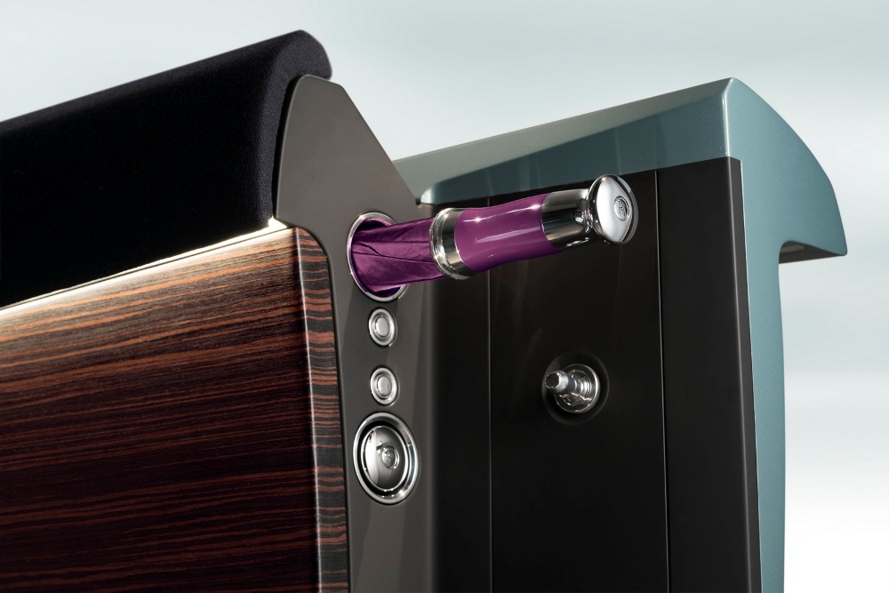 Encontramos una pantalla OLED transparente montada en la pared frontal de la cabina de pasajeros, la cual facilita toda la información que requieren, acompañado de un reloj analógico finamente trabajado que flota en una posición central sobre ella. Algunos detalles del exterior son las llantas de 28 pulgadas construidas a mano a partir de 65 piezas individuales de aluminio que quedan integradas en la carrocería, la cubierta de la carrocería que se abre hacia arriba para permitir a los pasajeros estar de pié y una luz roja que se proyecta para proporcionar una sensación de alfombra roja.