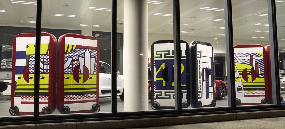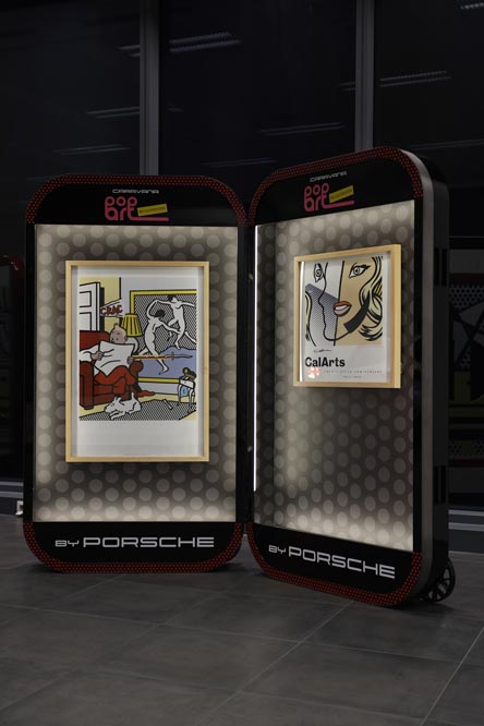 Estos dos exclusivos vehículos junto con diez de las obras del autor -“Crying girl” (1963), “Crak” (1963), “Foot and hand” (1964), “Ship board girl” (1965), “Sweet dreams baby” (1965), “Untitled head” (1995), “Whaam A” (1967), “Whaam B” (1967), “Tintin Reading” (1995) y “Festival de D´Automne” (1982)- recorrerán catorce concesionarios Porsche de España y Portugal para acercar los valores del mundo del arte a cualquier visitante, independientemente de si es o no cliente. Estas diez obras viajan protegidas en unas maletas, réplica gigante de la clásica maleta metálica de Porsche Design, de dos metros de altura y 150 kilogramos que se pueden desplazar gracias a unas minillantas monotuerca que imitan a las del 911 GTS. Si la parte delantera muestra el trabajo original de Roy Lichtenstein, la trasera hace lo propio con la obra mural que inauguró en 1994, tres años antes de morir, y que está en la entrada 42 de la Estación Central de Nueva York.