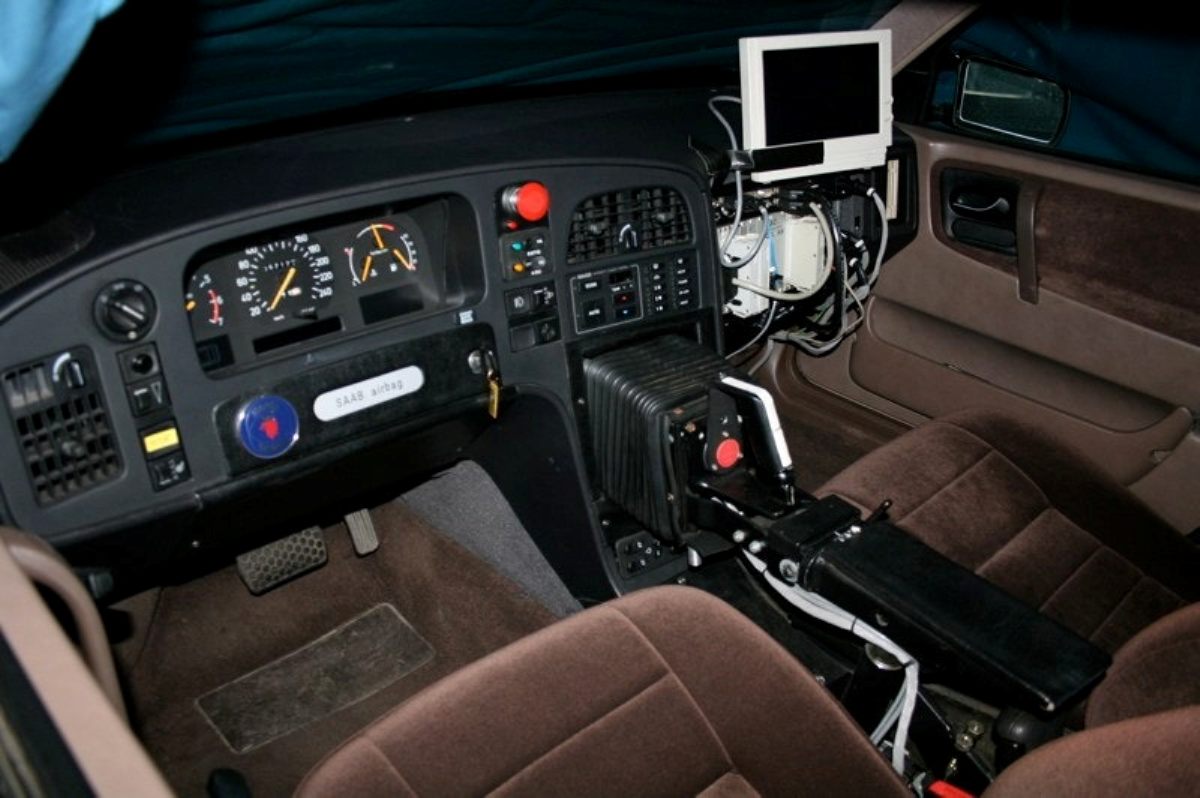 Los ingenieros de Saab eliminaron el volante y la columna de dirección del 9000, pero mantuvieron el airbag y el bombín de arranque ahora integrados en el salpicadero. También se prescindió de las clásicas palancas para luces, intermitentes y limpiaparabrisas, y se ubicaron en interruptores dentro de la propia consola central. Pero lo más llamativo era ese joystick que ahora brotaba desde el salpicadero, al lado derecho del conductor, y que permitía controlar la dirección del vehículo.