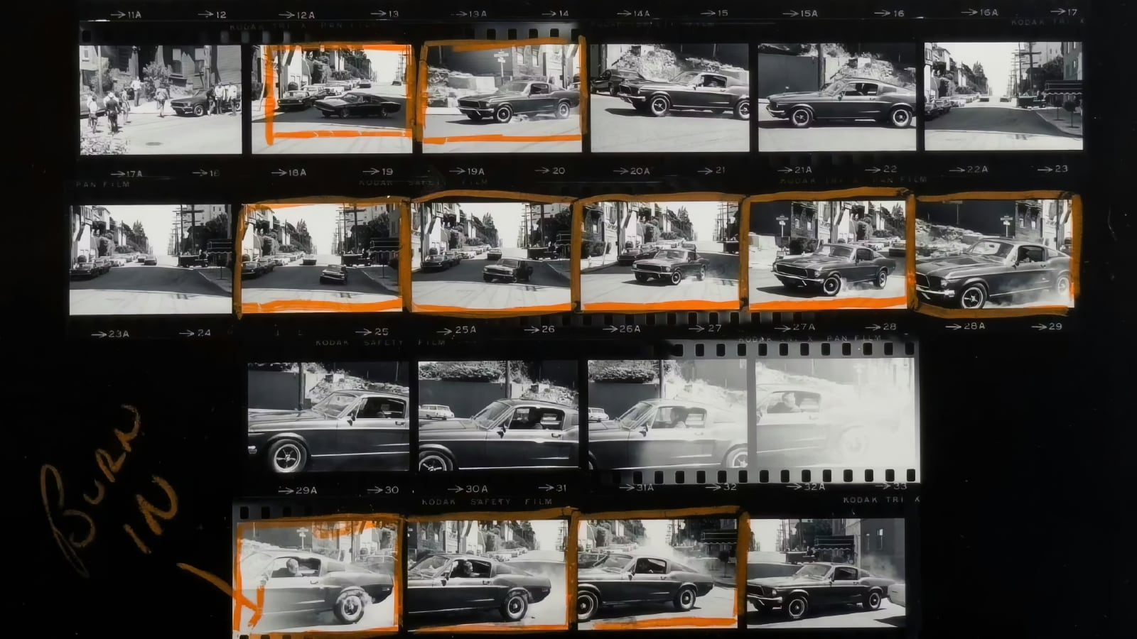 Tomadas por el prolífico fotógrafo Barry Feinstein y licenciadas a Ford por Sean Kiernan (cuya familia conservó el coche desde la década de 1970 hasta su subasta), estas tiras de película nunca se habían visto al público hasta ahora. No es que muestran un final diferente ni revelen información nueva sobre Steve McQueen, pero ofrecen una ventana a la vida real de una leyenda.