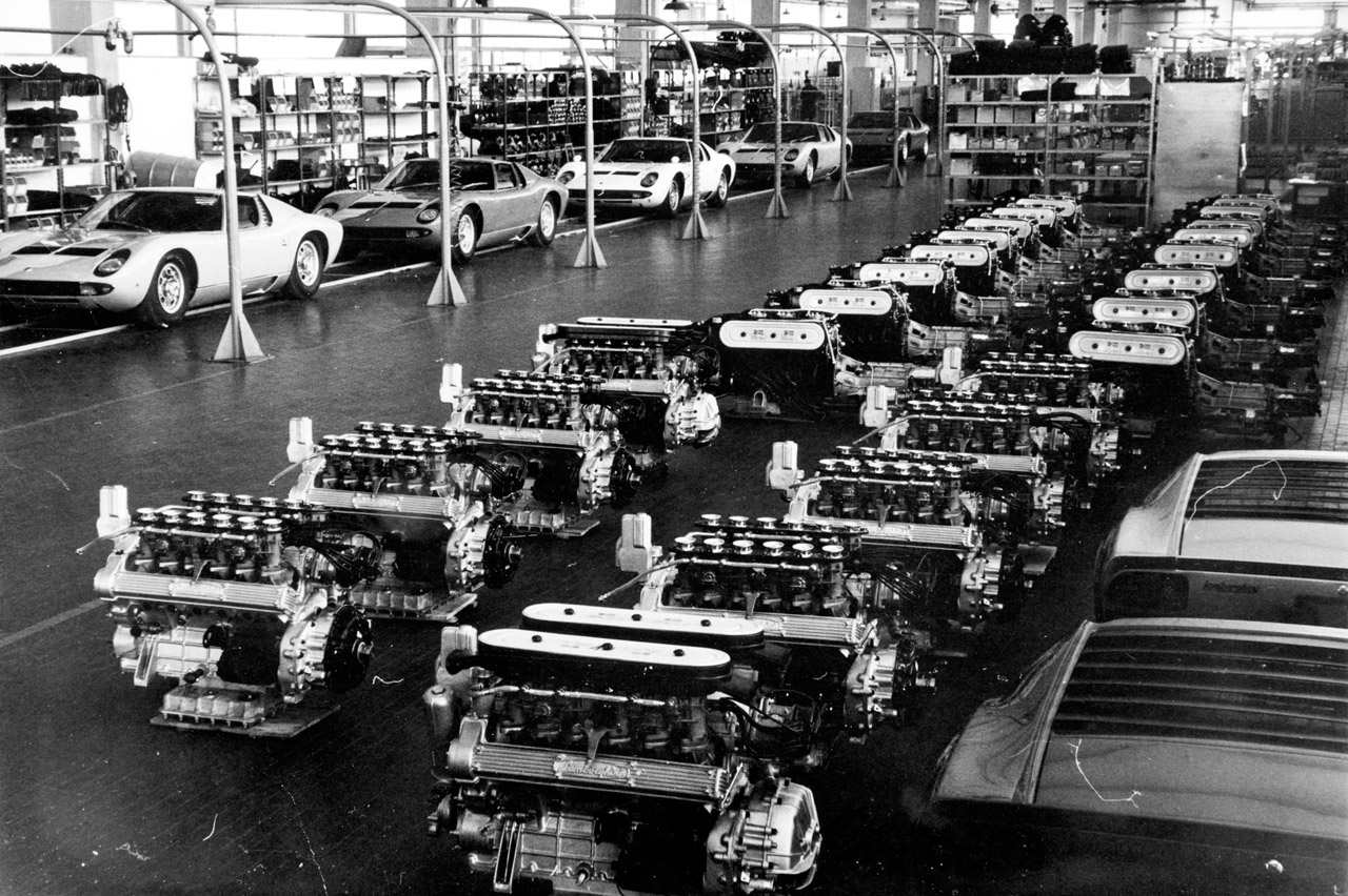 En octubre de 1963, la estructura principal de la fábrica ya estaba completa cuando se presentó su primer automóvil: el prototipo del Lamborghini 350 GTV, que después derivaría en el primer coche de producción de la firma italiana, el Lamborghini 350 GT. La producción de vehículos en la planta pasó de 67 unidades en 1965 a 425 en 1971, aunque en 1979, debido a la crisis económica de los años 70, cayó a 55, para recuperarse en los 80 hasta las 470 Lamborghini producidos en 1987 junto con 300 motores marinos.