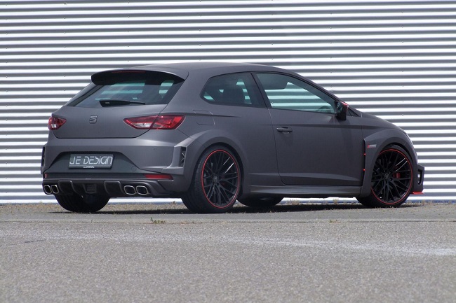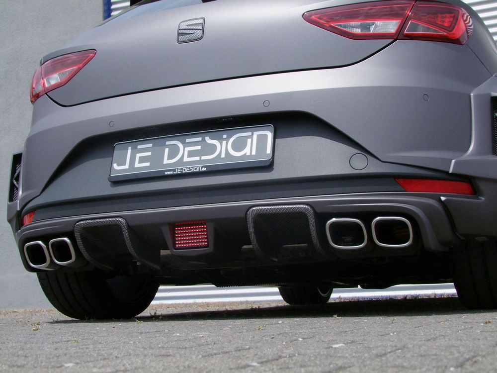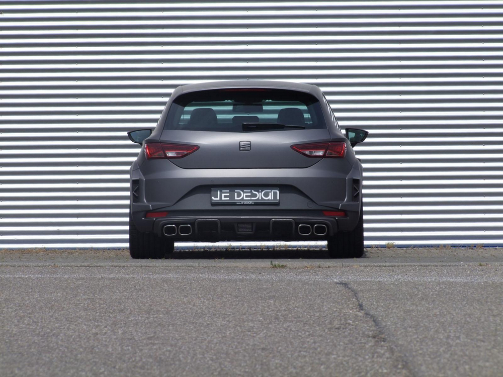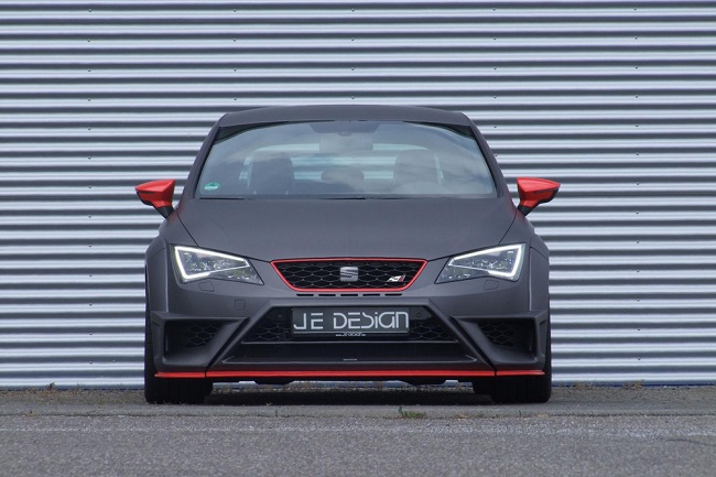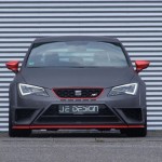 El SEAT León Cupra SC JE Design Wide Body luce una imagen mucho más agresiva que la de la versión que ya conocíamos del preparador alemán y que os mostramos hace unos meses, el León Cupra JE Design ‘a secas’, y su aspecto también es infinitamente más radical que el del modelo de producción, el SEAT León Cupra 2014. El precio del kit completo, sin incluir las llantas ni el montaje, es de 6.188 euros. Con su carrocería ensanchada y unos parachoques con un aspecto más agresivo, el León Cupra SC JE Design Wide Body casi parece un modelo de competición. De hecho, en el comunicado de prensa, el preparador asegura que su diseño está inspirado en el del radical SEAT León Cup Racer que la marca presentó en la pasada edición del festival de Wörthersee. Lo más curioso es que esta preparación es todavía más potente que el prototipo que mostraron en Austria.
