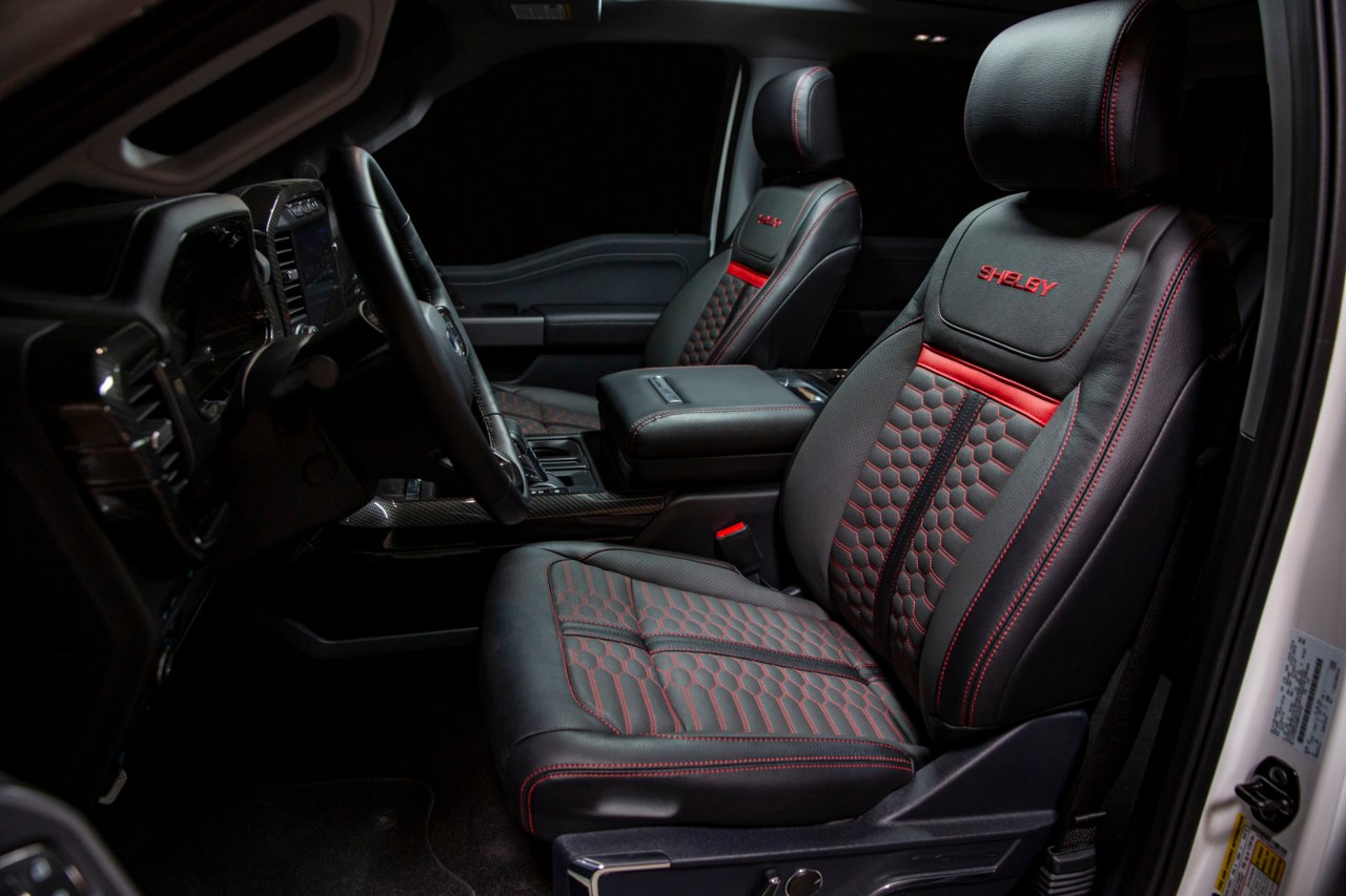 Basada en la variante Lariat 4x4 de la F-150, esta preparación realizada por la firma Shelby American está llena de detalles agresivos. Desde las entradas de aire en la parte delantera del capó hasta el paragolpes delantero renovado, pasando por las llantas de aleación de 22 pulgadas equipadas con neumáticos todoterreno de 35. Las ventanillas tintadas y la doble raya negra que lo atraviesa de adelante atrás completan el efecto.